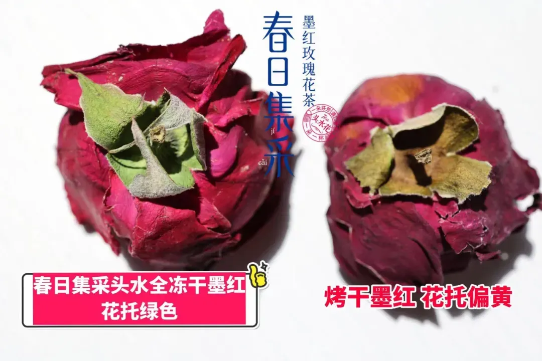 春日集采头水全冻干,花托呈绿色VS烤干花,花托偏黄。