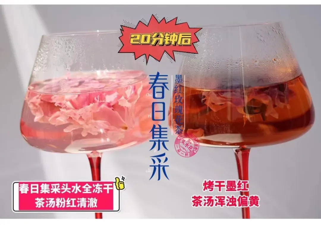 春日集采头水全冻干,茶汤粉红,清澈透亮VS烤干花,茶汤浑浊,颜色偏黄。