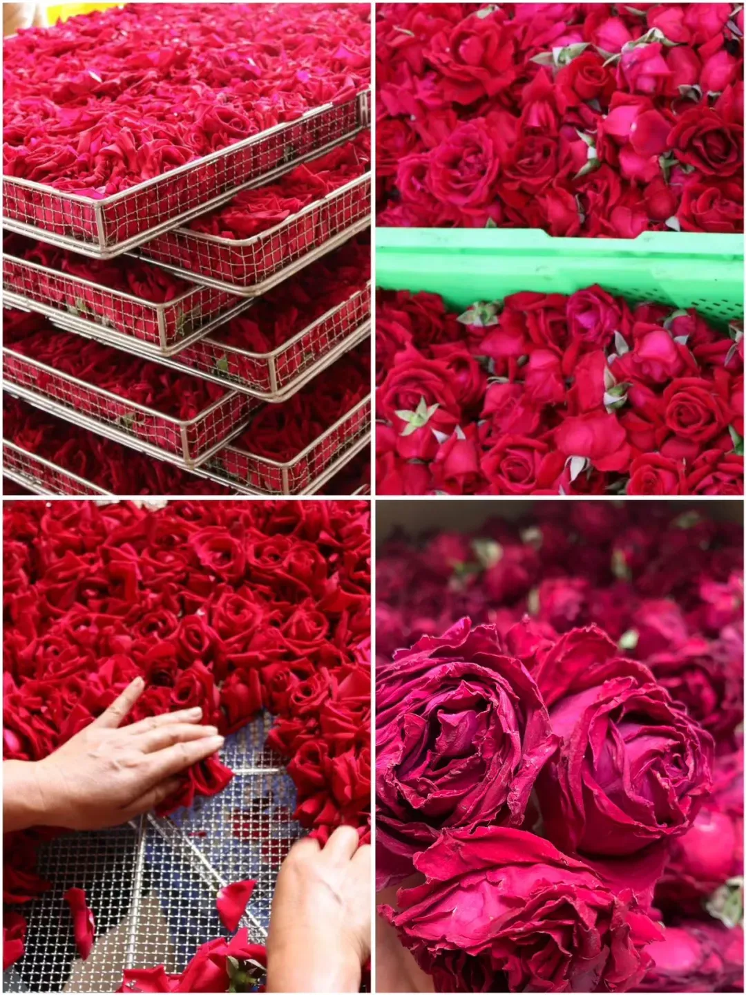 咱们的墨红玫瑰新鲜采摘后,冷链车3小时内到工厂,手工分拣、摆盘,进入冻干设备。