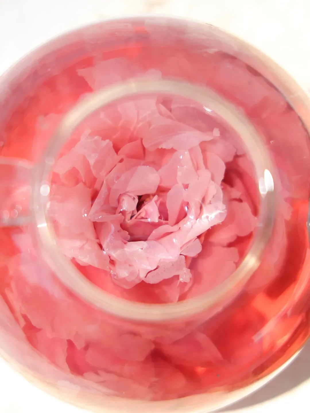经冻干后的“头水花”,泡在水里,颜色极为艳丽,室内散发着阵阵清香。茶面上,还漂浮着仙女们的最爱——玫瑰精油!