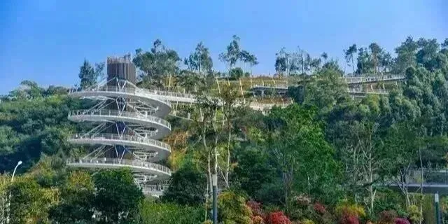 整个步道几乎架立在空中,视野格外的好。项目中的桥梁很多,多座特色节点也成为市民和游客最爱的打卡点,比如位于东渡邮轮码头附近的和熙楼,螺旋向上的特色景观如同梦幻的万花筒一般,与狐尾山气象塔互相呼应,风景如画。