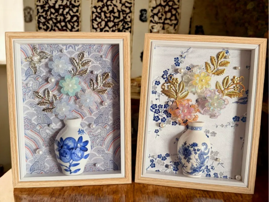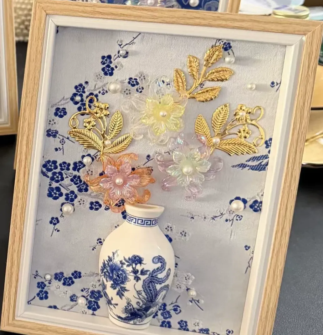 将奢华宋锦面料、温润珍珠与现代画艺结合,制作高雅轻奢的装饰画。在一丝一缕、一珠一画中,沉浸式体验非遗技艺的精致与匠心。