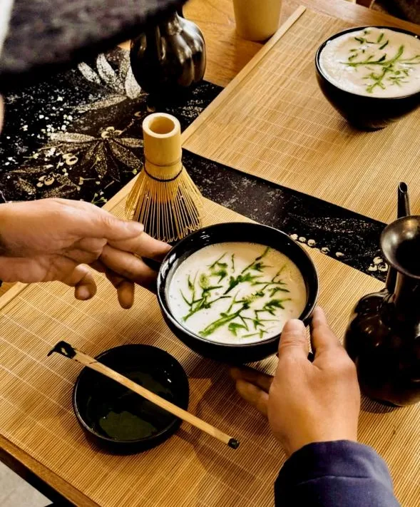 继之量茶注汤,边注边用茶筅击拂
