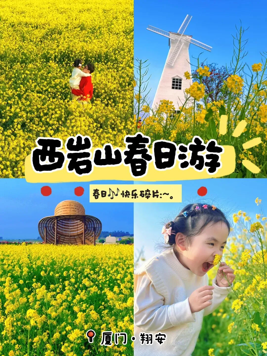 13:30出发前往参观【西岩山都市田园】西岩山都市田园位于福建省厦门市翔安区凤翔街道,是翔安区“乡村振兴示范工程”的标杆项目。四季有不同的花卉和农作物景观,如油菜花、向日葵等,形成如诗如画的田园风光。当下正是油菜花开的季节,走进西岩山都市田园,千亩油菜花田如金色海洋般铺展开来,游客们穿梭其间拍照留念,交织成一首春日交响曲。