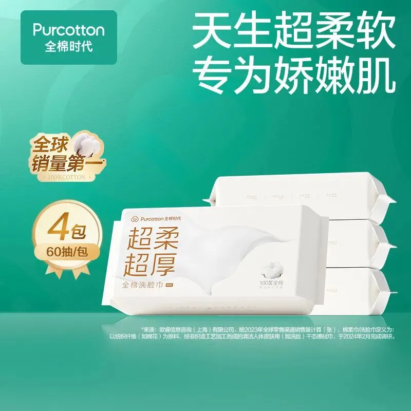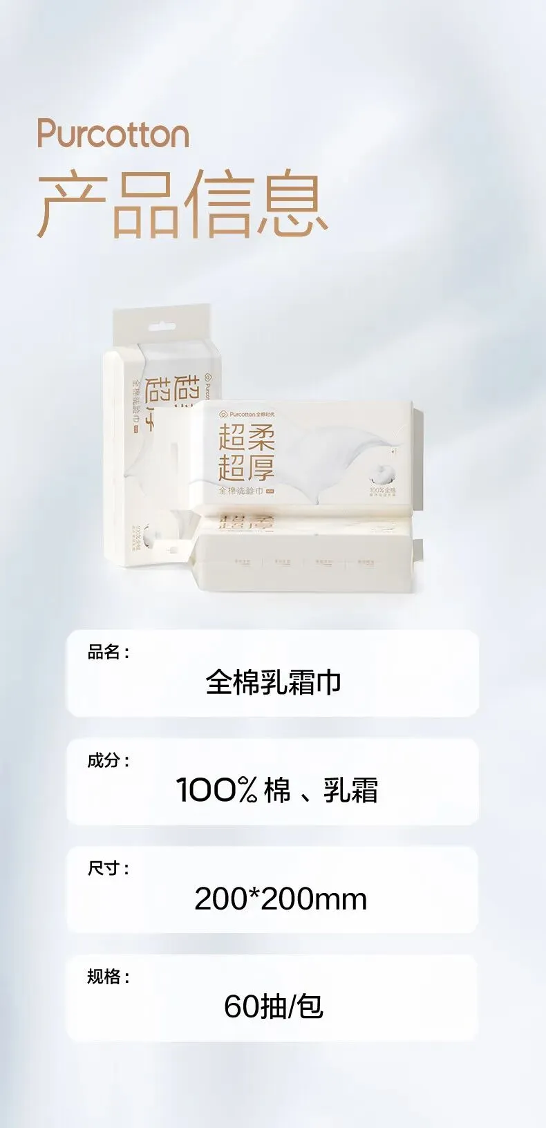 【名称】超柔全棉洁面柔巾60gsm乳霜,200*200mm,60片/包,4包/袋