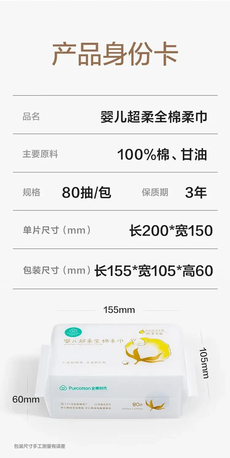 【名称】婴儿超柔全棉柔巾50gsm,200X150mm,80片/包,6包/袋