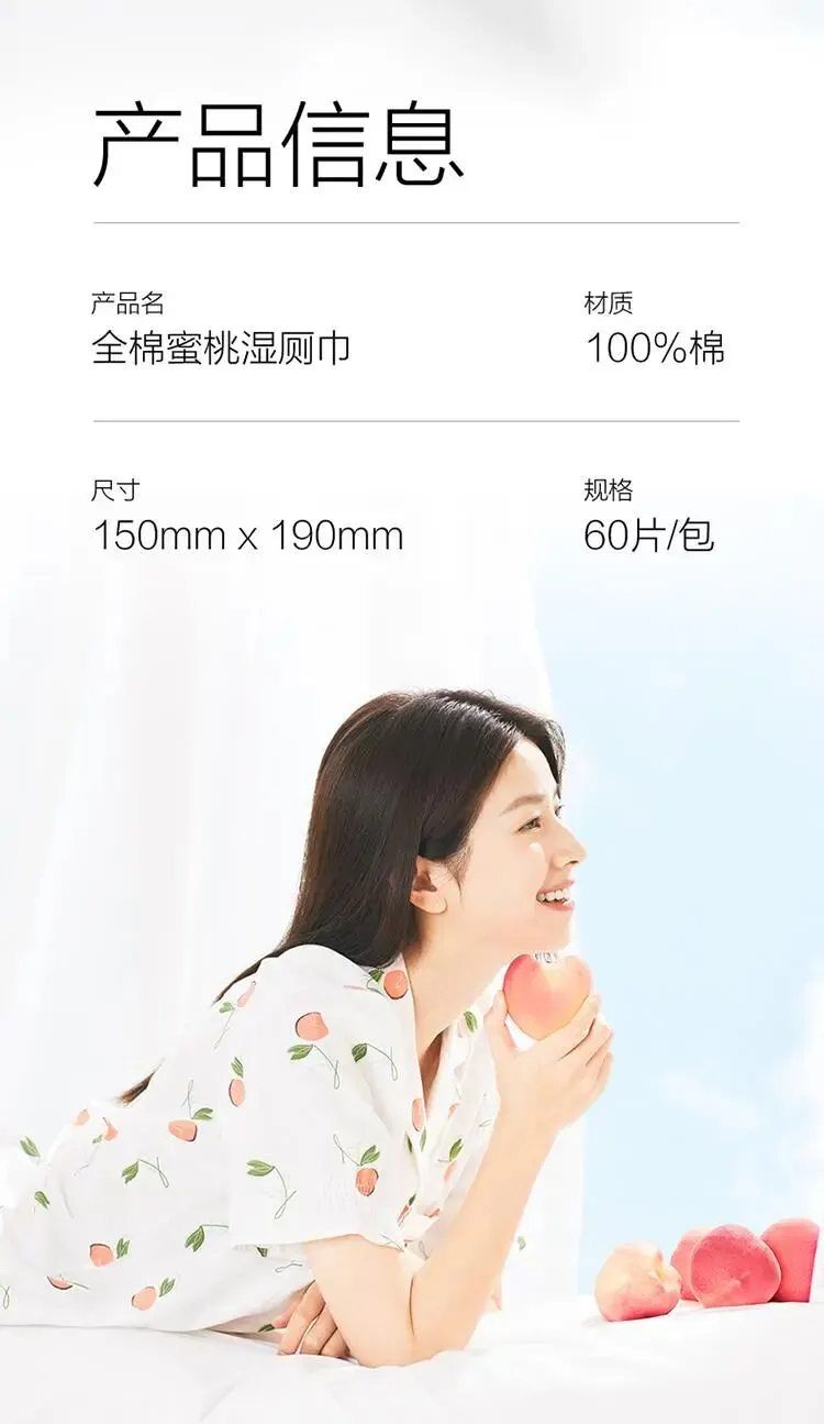 【名称】全棉蜜桃湿厕巾65gsm,190mmx150mm,60片/包,3包/袋