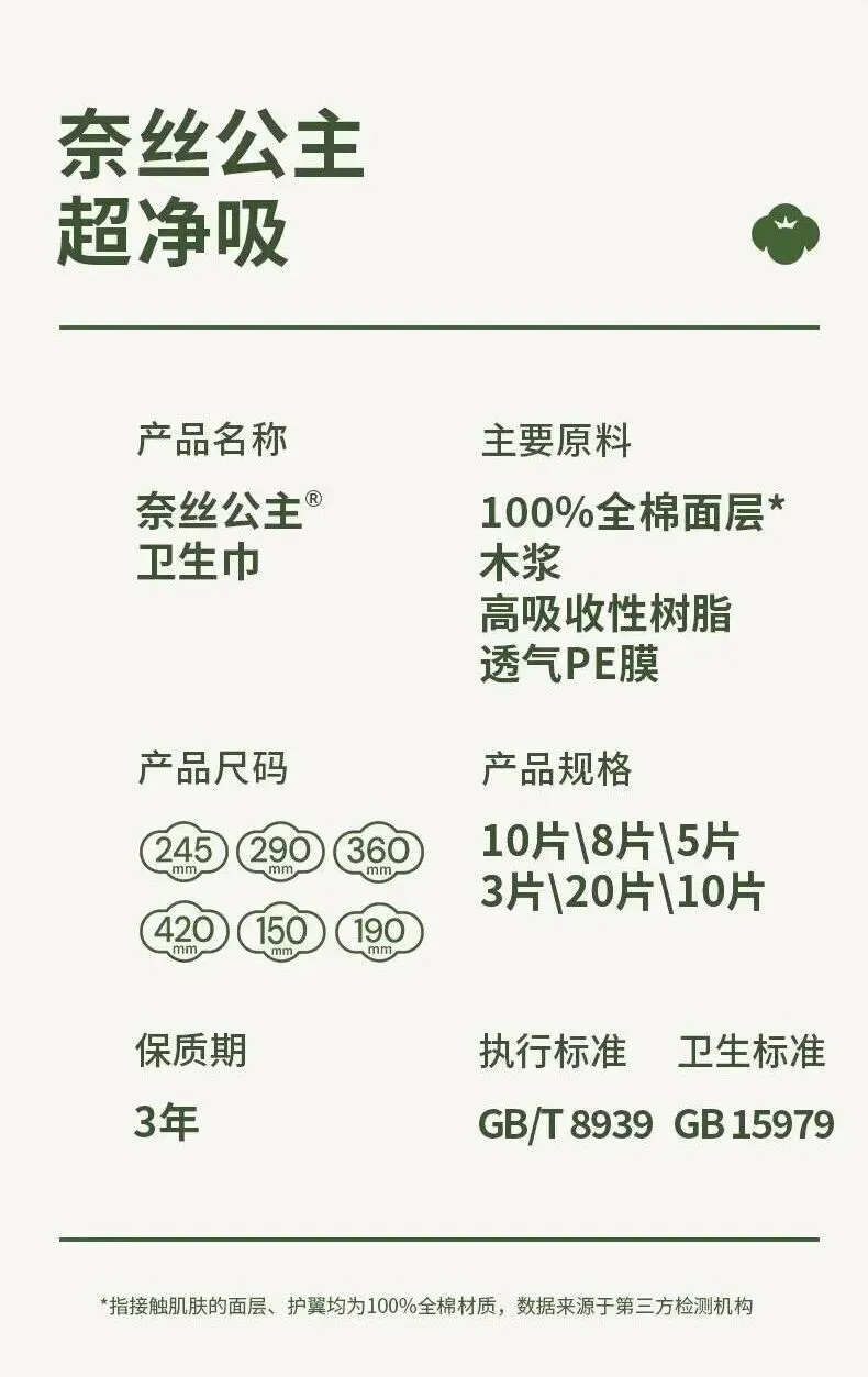 【名称】奈丝公主超净吸系列100%全棉卫生巾2月装(245mm10片/包×5包+290mm8片/包×1包+420mm3片/包×2包
