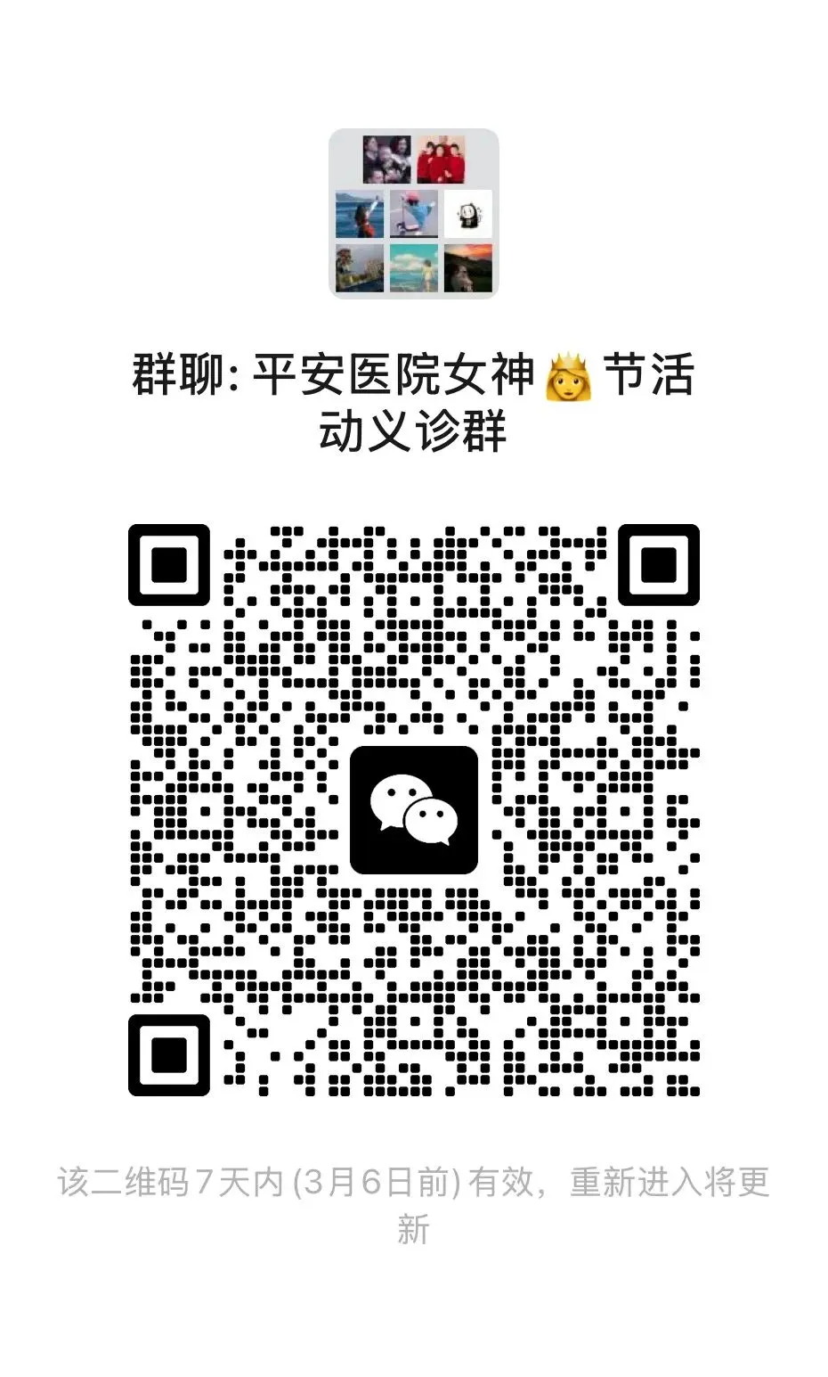 • 扫码加微信,加入“女神节义诊活动群”,进群后请发送“姓名+年龄+预约日期”。