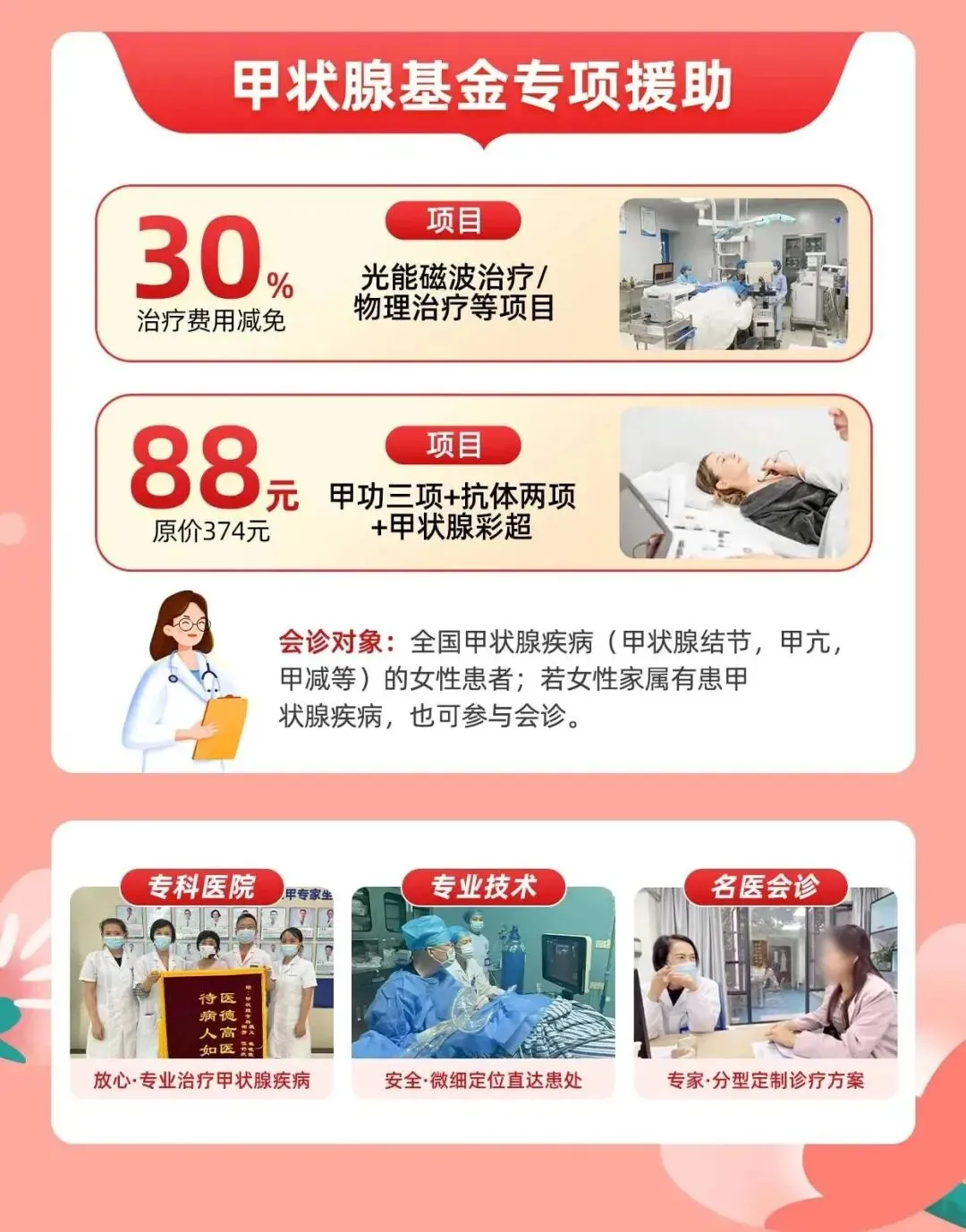 活动期间,凡到院进行甲状腺相关治疗的患者,均可享受30%治疗费用减免,减轻就医负担,安心接受专业诊疗。✅ 适用治疗项目:
