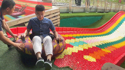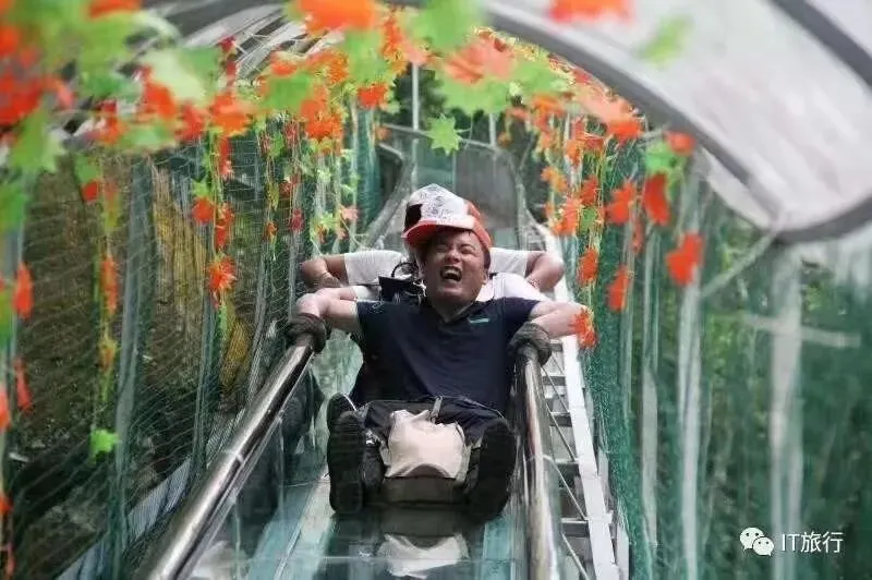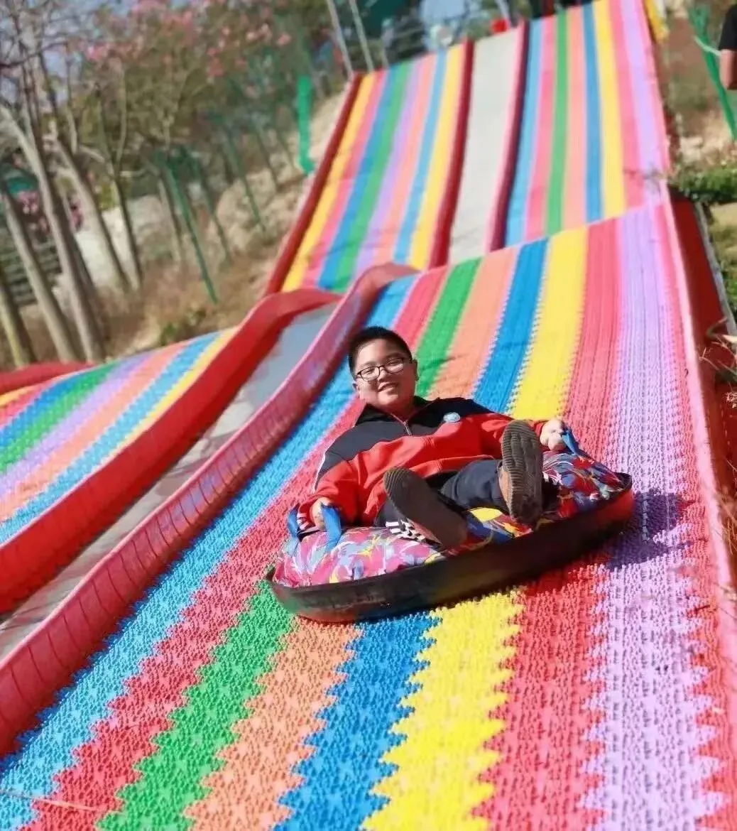 色彩靓丽,大人小孩皆可玩。从远处看如同一道七色彩虹挂在山上,从长长的彩色滑道上面滑下来,尖叫、刺激、欢呼,过瘾!