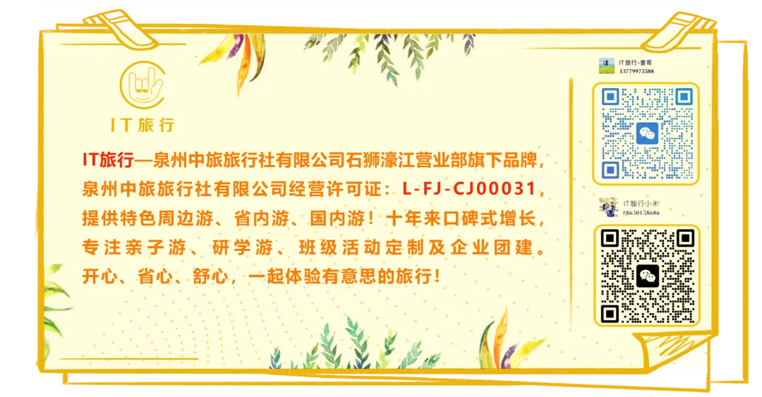 IT旅行(爱探研学)--泉州中旅旅行社有限公司石狮濠江营业部旗下品牌,经营许可证:L-FJ-CJ00031,每周末组织周边一日游,不定期推出长线游,出境游!提供特色周边游、省内游、国内游!开心、省心、舒心,一起体验有意思的旅行!致力于为5-16岁亲子家庭提供优质的亲子旅行、研学游和独立营活动。十年历程,口口相传,信誉第一,客户至上,现为中国亲子游联盟成员。