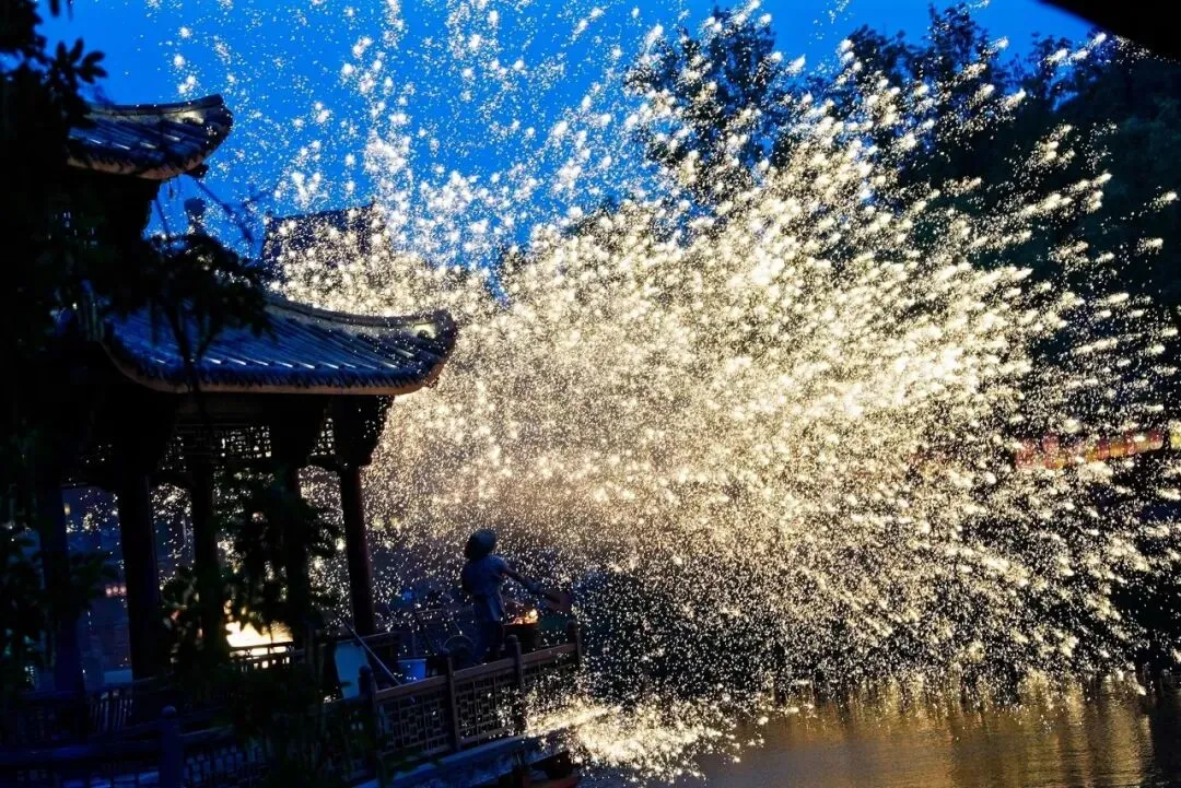 打铁花火花四溅,似流星坠落