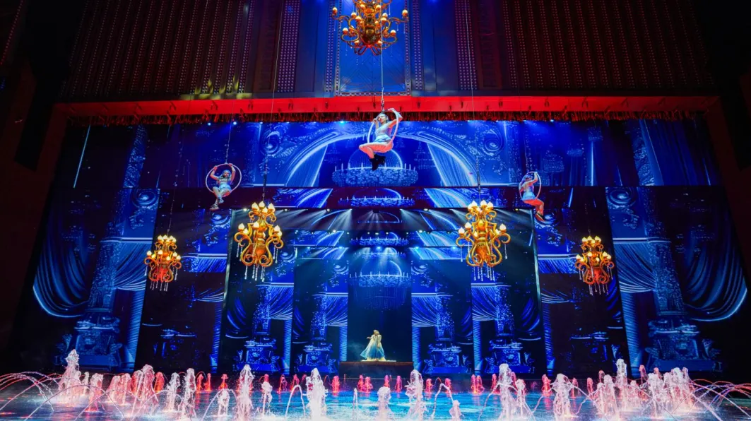 走进场馆,水幕投影与喷泉特效在灯光映衬下提前营造出奇幻氛围。
