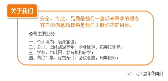 河北嘉年华国旅拥有强大的景区和媒体资源,完善的旅行社资质保障,专业的服务团队及丰富的经验,为客户提供全方位旅游出行、休闲度假、商旅管家等服务。安全、专业、品质是我们一直以来秉承的理念,客户的满意和惊喜是我们不断追求的目标。