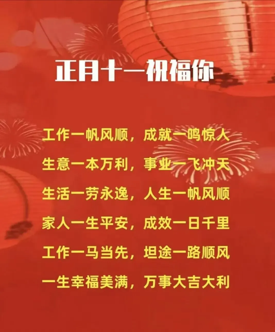 13、今天正月十一,送你十一个一,一心一意祝福你,一生一世无忧愁,一年一度皆顺利,一夕一朝都欢喜,一言一行受尊敬,一劳永逸乐不已。十一个“一”字伴你行!