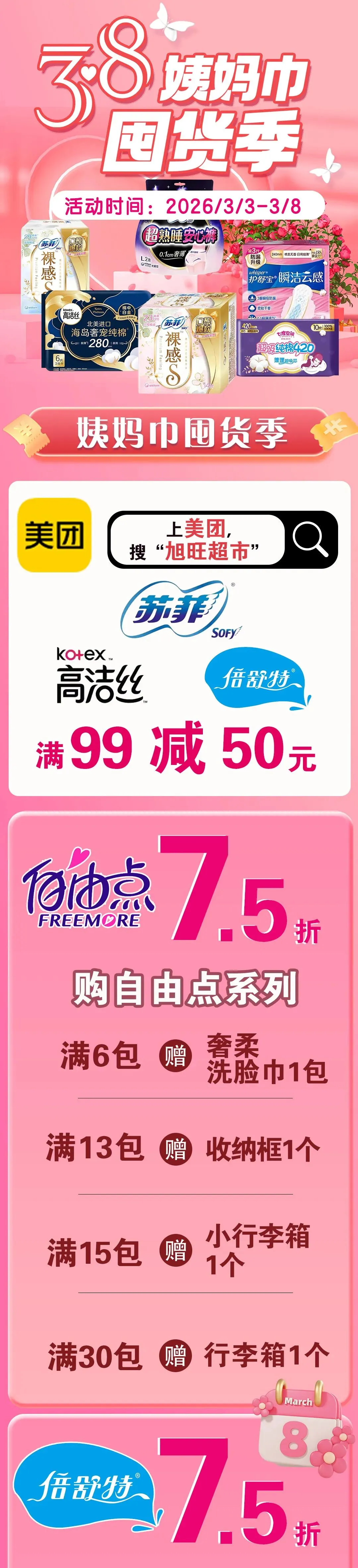当前位置:首页>美女资讯>【女神节囤货季】3月3日-8日,姨妈巾7.5折!满就送!