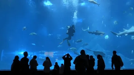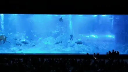 鲨鱼王国一层海底巨幕,观看鲨鱼喂食秀。如果你想亲眼目睹海中“黄金风暴”的真面具,一定不能错过它哦~