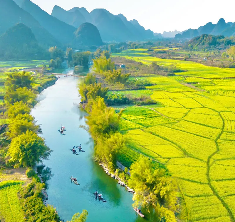 十里画廊是阳朔县第一条彩色公路,也是最有颜值的一条道。就像在欣赏一幅徐徐展开的中国山水画的长卷,为阳朔景观核心带,坐车一路可观赏骆驼过江,美女照镜,孙悟空过火焰山,唐僧打坐,羊角山,大榕树,月亮山等知名景点。烟花三月的十里画廊化身金黄花海。峰林为屏,遇龙河碧水为带,万亩油菜花田以金色泼墨画势展开,金黄花絮缀满青翠田埂。晨雾缭绕时花枝凝露,蝴蝶逐浪穿行花间,竹筏载着光影划过河面。在此美拍打卡,取景与田埂借群山作框幅,或俯身低机位捕捉露珠里的春天。