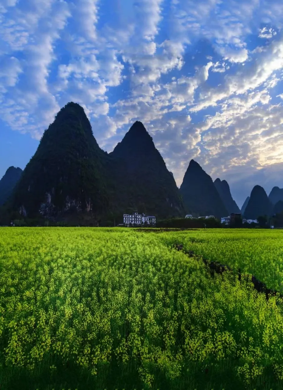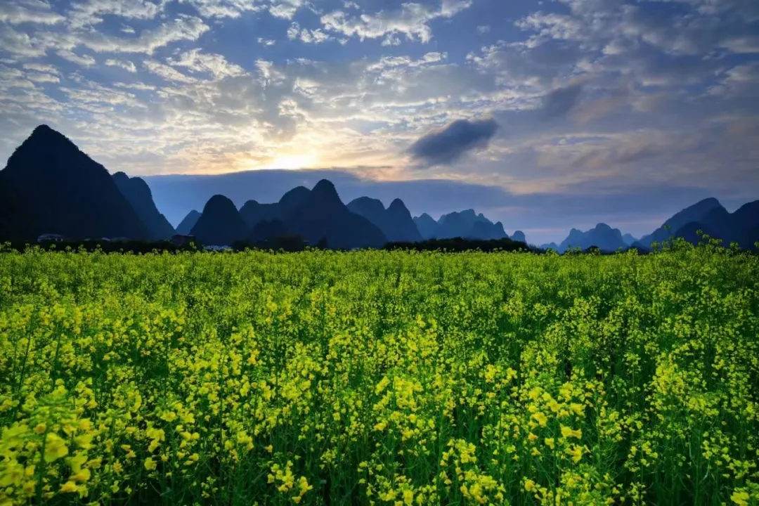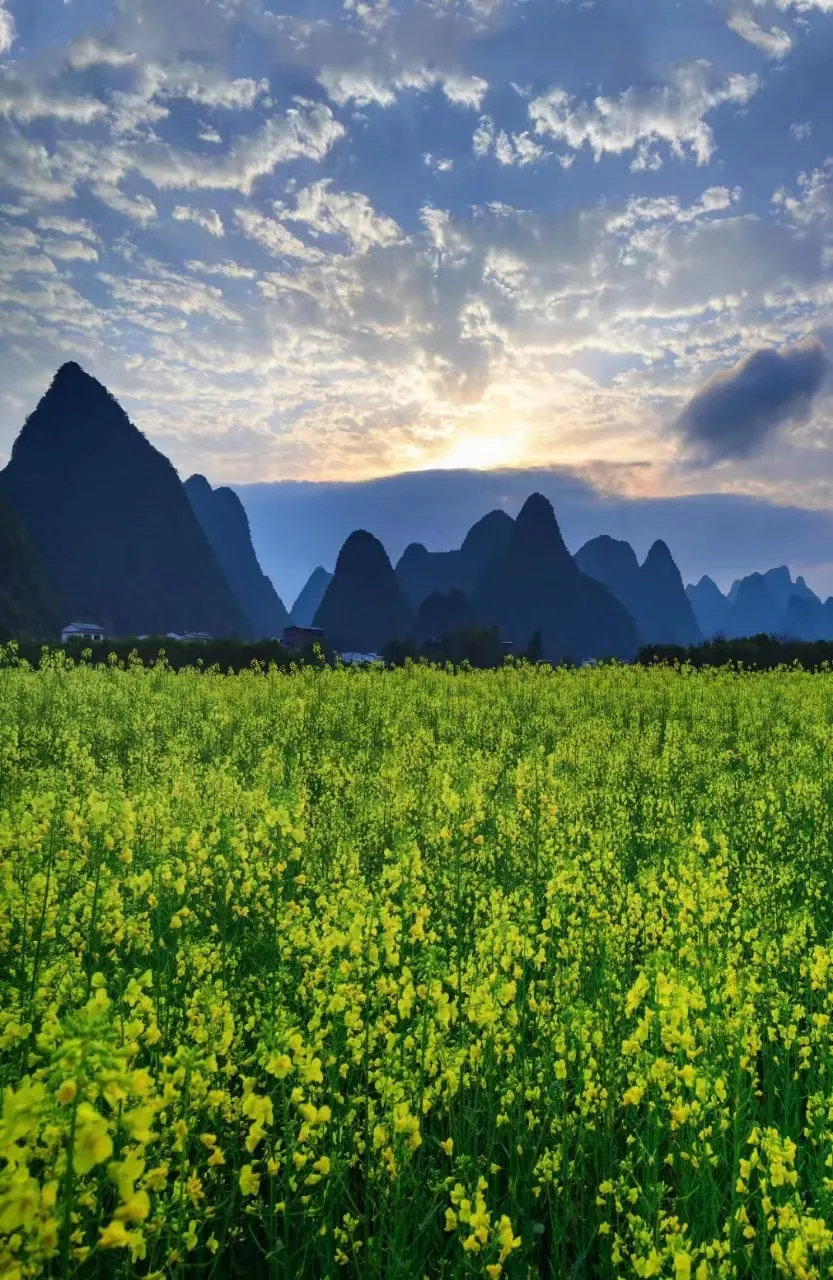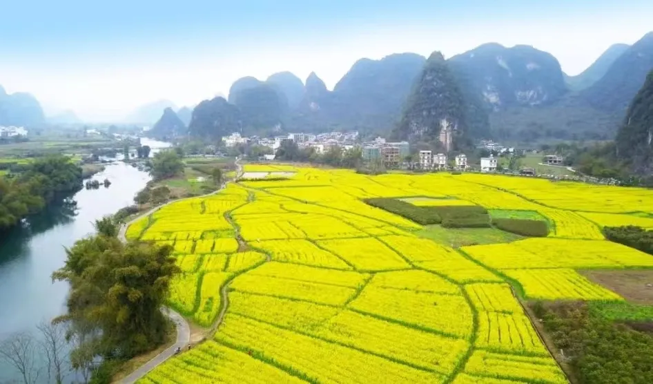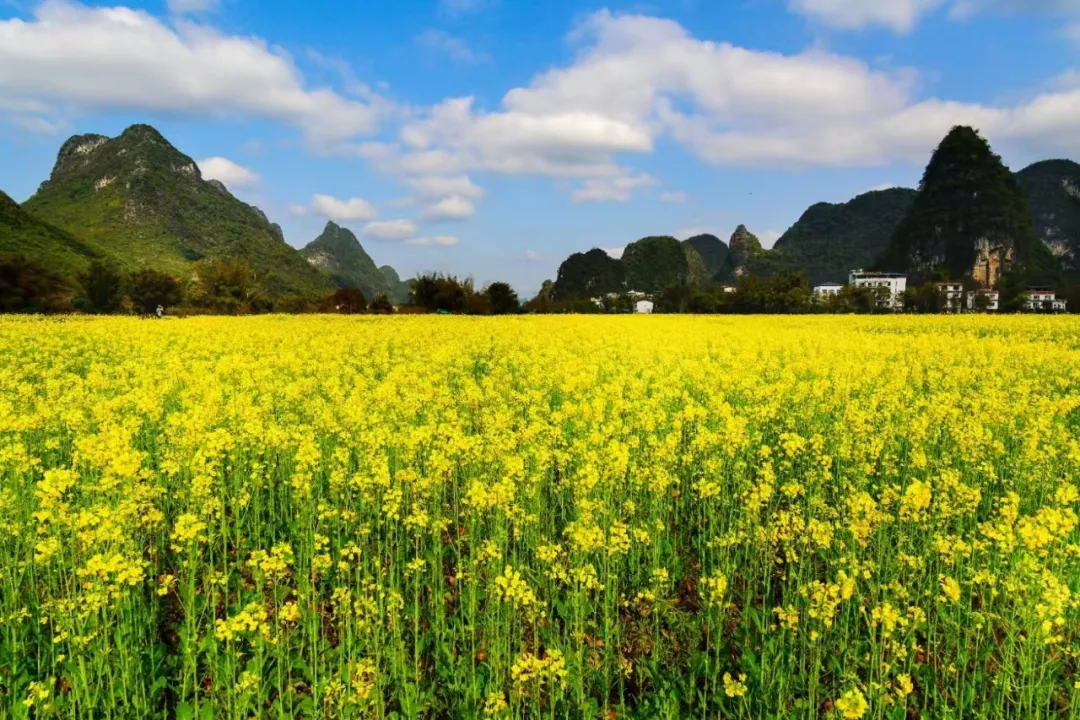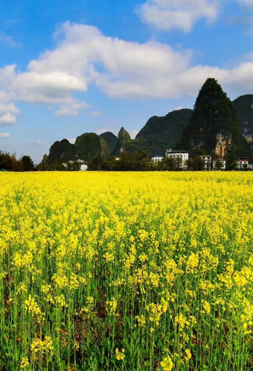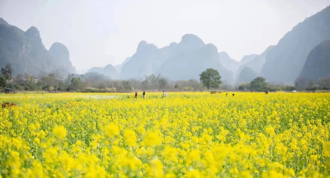 在我们熟知的阳朔,每到春天时节,村落油菜花争相盛放,往往美得毫不含蓄也毫不羞涩。