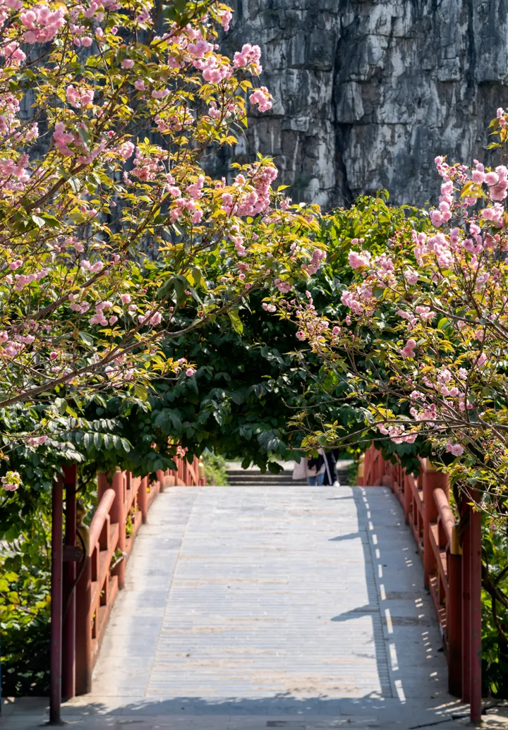 “南溪新霁”是桂林八景之一(游览时间约 50 分钟),当春风拂过南溪山,樱花、桃花和杜鹃竞相绽放,粉白绯红的花潮与峻峭的山岩相映成趣。沿着樱花大道漫步,花瓣随风翩跹;玉带桥畔古亭掩映于桃李之间,朱檐花影倒映在碧水中,偶有汉服少女执伞穿行,定格成流动的诗意画卷。白龙洞前古刹旁,野生杜鹃自岩缝中盛放,恍见“山寺桃花始盛开”的禅意。景区内将赏花活动与当地文化巧妙融合,在这里,刚劲的山水与柔美的花姿相互碰撞,千年历史与刹那芳华交织,成为桂林春天最鲜活的风物诗。