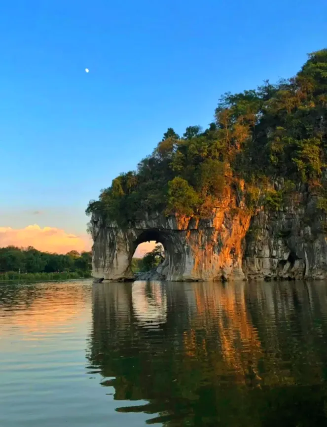 【象鼻山】(游览时间约 50 分钟)其山酷似一头驻足漓江边临流饮水的大象,栩栩如生,引人入胜,山体前部的水月洞,弯如满月,穿透山体,清碧的江水从洞中穿鼻而过,洞影倒映江面,构成“水底有明月,水上明月浮”的奇观,只有在这里拍的照片才是正面的。