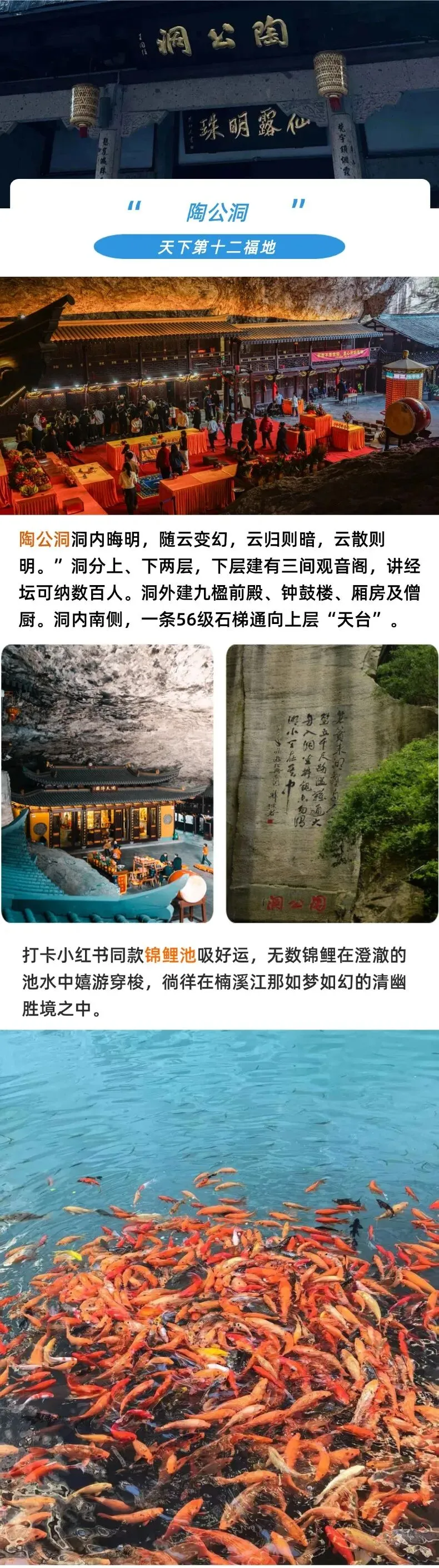 后车赴被誉为“永远的山水诗、最美的桃花源 ”的楠溪江景区,打卡网红小红书同款【锦鲤池】(游览时间不少于30分钟)吸好运在楠溪江那如梦如幻的清幽胜境之中悠游嬉戏的红鲤嬉戏打卡,游览【陶公洞】(游览时间不少于50分钟)陶公洞被道家誉为"天下第十二福地",位于大若岩山脚下,是一大型天然岩洞。洞高 56 米,宽 76 米,深 79 米,是浙南最大的石室。