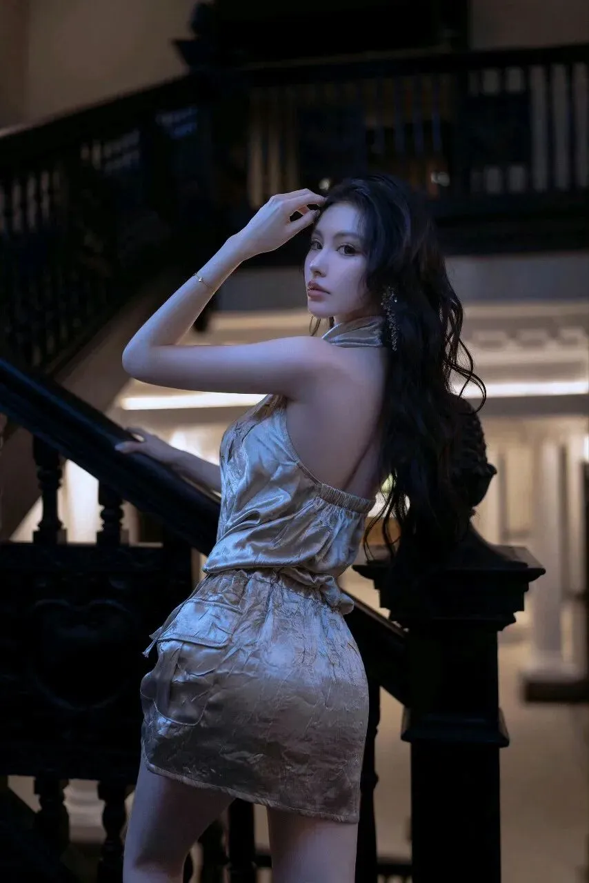 镜头里的她,倚在楼梯扶栏边,发丝如墨瀑般垂落,与鎏金裙的冷调光泽形成绝妙的反差。挂脖式的剪裁利落勾勒出肩颈的线条,蝴蝶骨在缎面的映衬下,似振翅欲飞的蝶,每一寸弧度都藏着不经意的美感。露背的设计大胆却不艳俗,缎面的褶皱顺着腰背的曲线自然垂落,像是被晚风轻轻拂过的湖面,漾开细碎的波纹。她抬手轻触发梢的瞬间,腕间的细链与裙身的光泽交相辉映,连空气里都仿佛飘着鎏金的甜香。