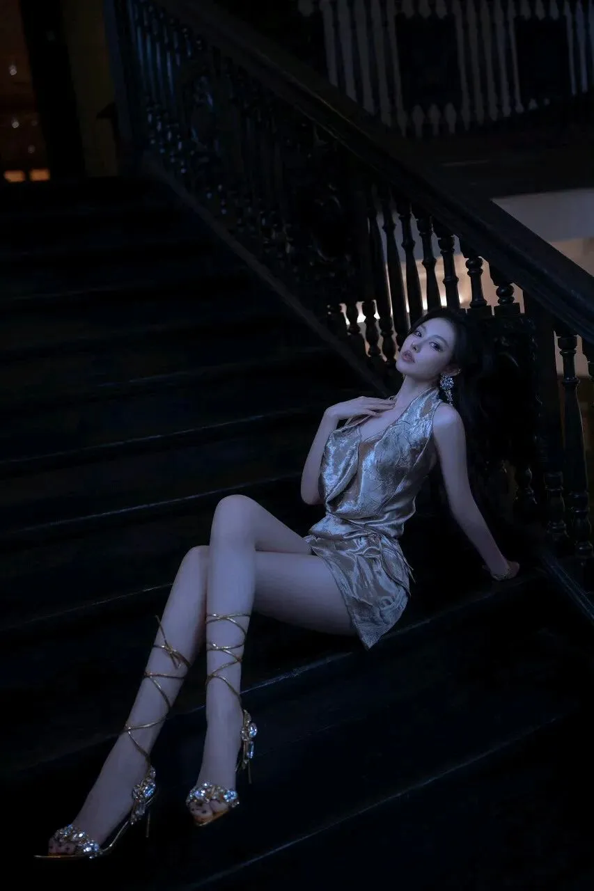 移步至楼梯台阶,她屈膝而坐,鎏金裙的裙摆随动作微微堆叠,褶皱里盛着夜色的朦胧。缠绕的金色绑带高跟鞋顺着小腿线条向上延伸,与裙身的鎏金质感遥相呼应,仿佛将星河的碎光缠在了脚踝。指尖轻搭在胸前,脖颈微扬,目光望向镜头之外的方向,那抹慵懒又疏离的神情,让整个画面多了层故事感——像是古堡里等待赴约的公主,又似在夜色中独酌的优雅旅人,于静谧中自成风景。