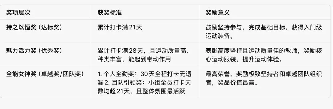 根据累计打卡天数及运动表现,我们设立了三个奖励层次: