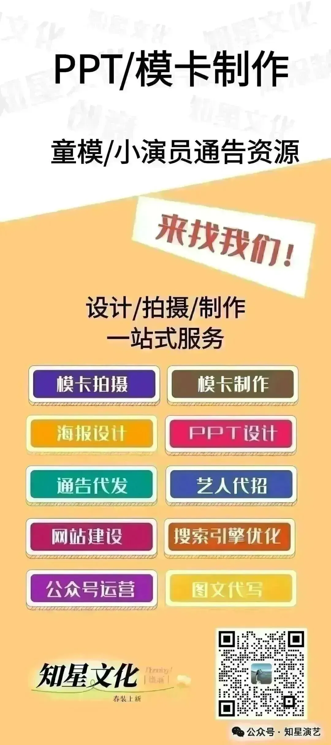我们长期从事演艺资源对接方面的工作,积累了非常多的商家经纪资源。专业提供小演员,小模特,平面拍摄,服装拍摄,商品拍摄,买家秀,时装周,走秀,影视,短视频,tvc,宣传片,群演,综艺等专业提供靠谱圈内影视拍戏通告信息服务。知星文化专业与影视小演员、小模特、童模通告对接与选角casting模卡拍摄方面的工作,在影视圈内汇集合作和认识的大量的演员和副导演、群头、经纪 商家等职业人群的资源。