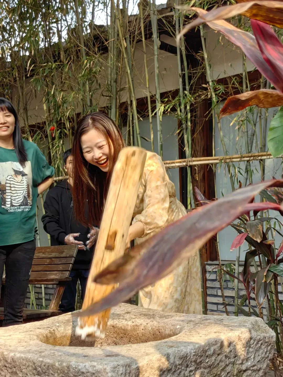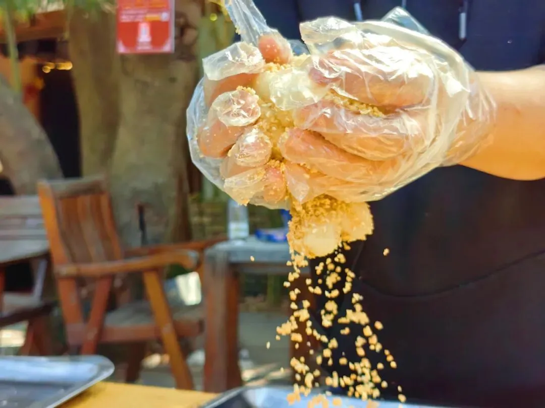 打糍粑可是个技术活,讲究快、准、稳、狠,这样糯米才能打得均匀,打得瓷实,黏糊糊的有韧性。将蒸熟的糯米饭盛出来,倒入特制的石槽,一人抡着特制的木锤搓打糍粑。最让人回味的是搓成汤圆大小的糍粑裹着一层花生碎,那种美味和惬意,简直难以用语言来形容。
