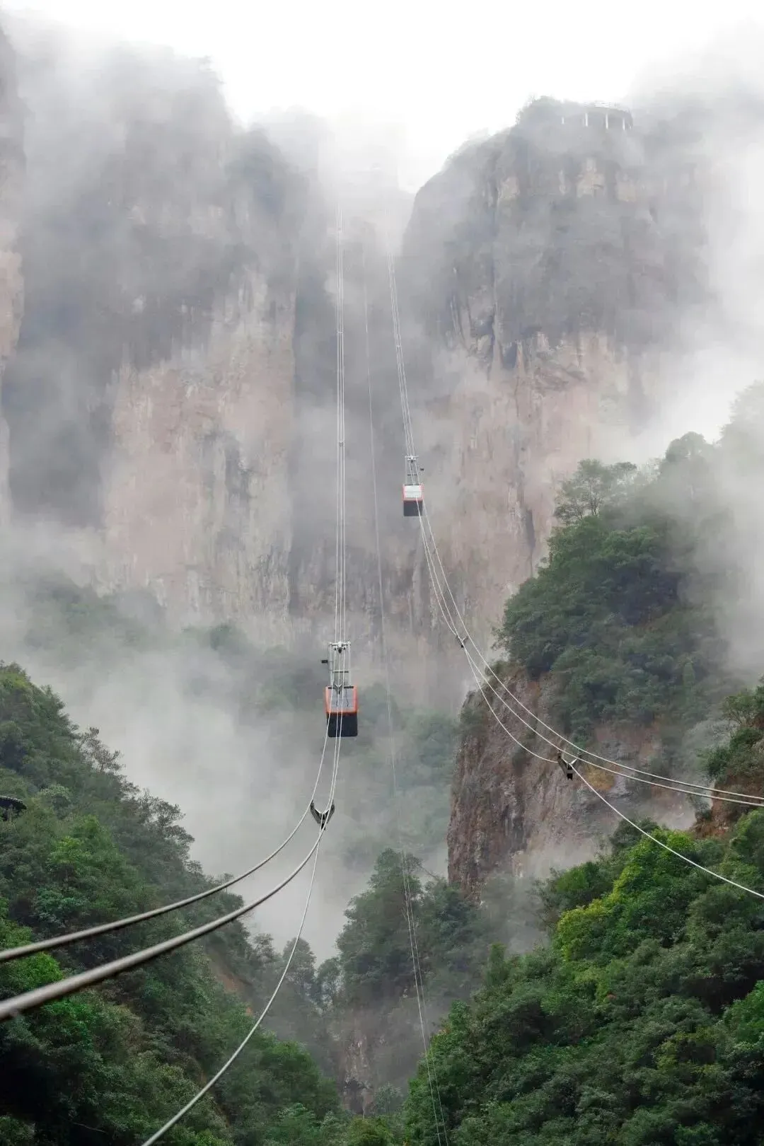 新索道颜值高、运量大、速度快、舒适性好,为单线循环脱挂抱索器八人吊厢索道,是国际流行的先进索道形式,最多可同时托挂38个吊箱,单向最大运力为2400人/小时,是原南天索道运力的7倍,神仙居索道正式告别排长队时代。