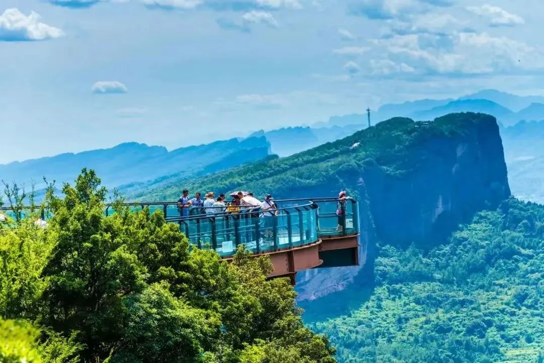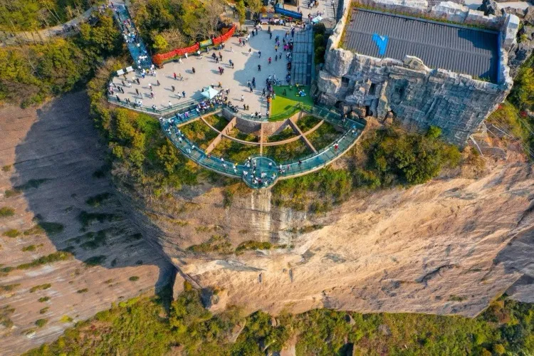 通过鸟道与猿猱道,便可踏上玻璃观景平台,脚下是悬崖峭壁,头顶是一望无际的蓝天,漫步其间,仿佛双脚腾空,在云端之上行走。