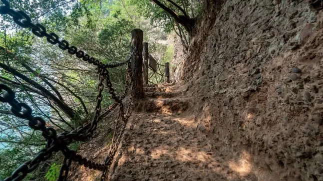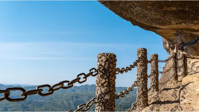 和鸟道相比,猿猱道更为险峻,这里没有护栏,路面也更狭窄,攀登者仅靠腰间的安全绳,与手中的铁扣扣住铁索,单人单向缓慢前行。