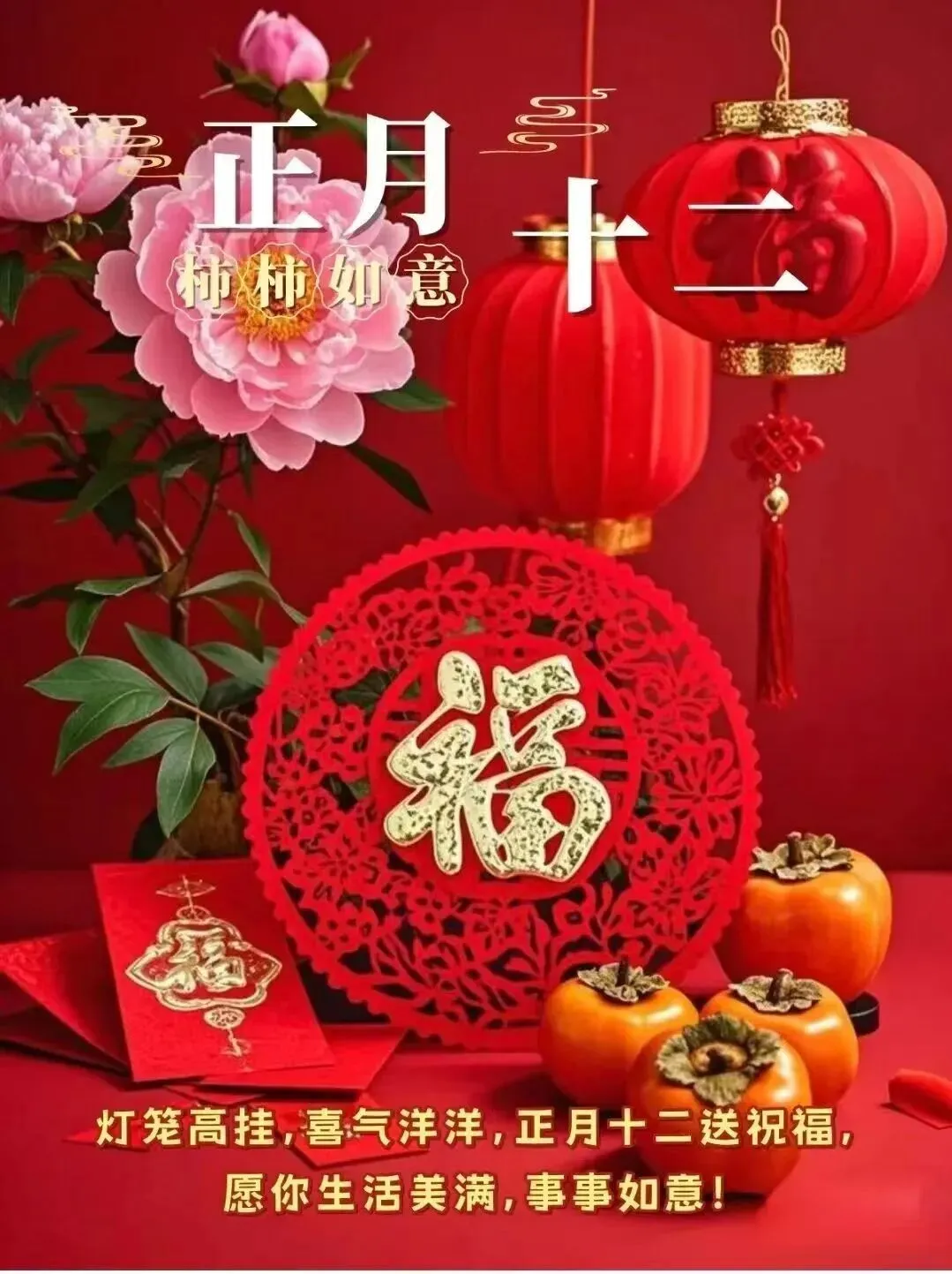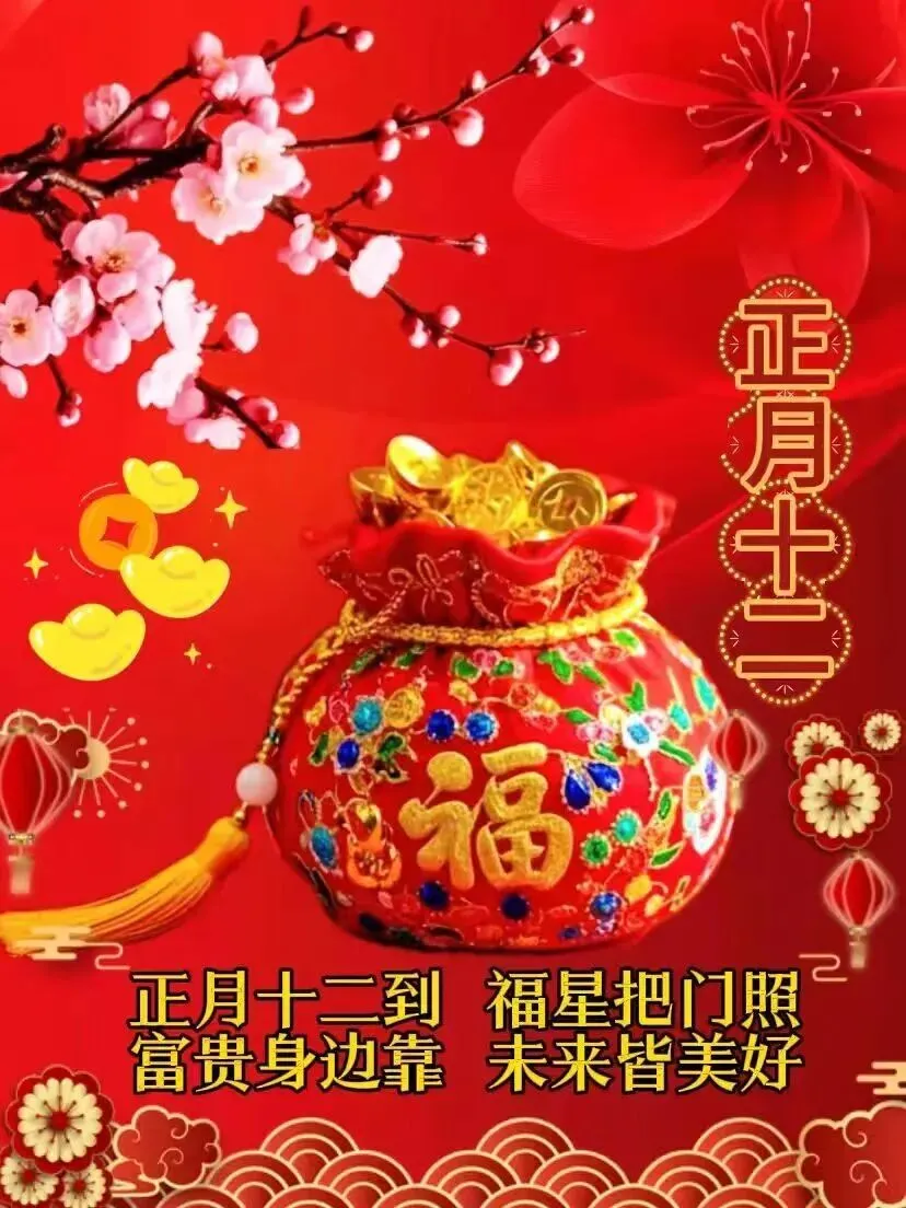 今天是正月十二,送你十二分的祝福,愿你在新的一年里你和家人福寿安康,大吉大利,万事顺意。恭喜发财。亲爱的朋友们,正月十二到,好运从此接连不断!