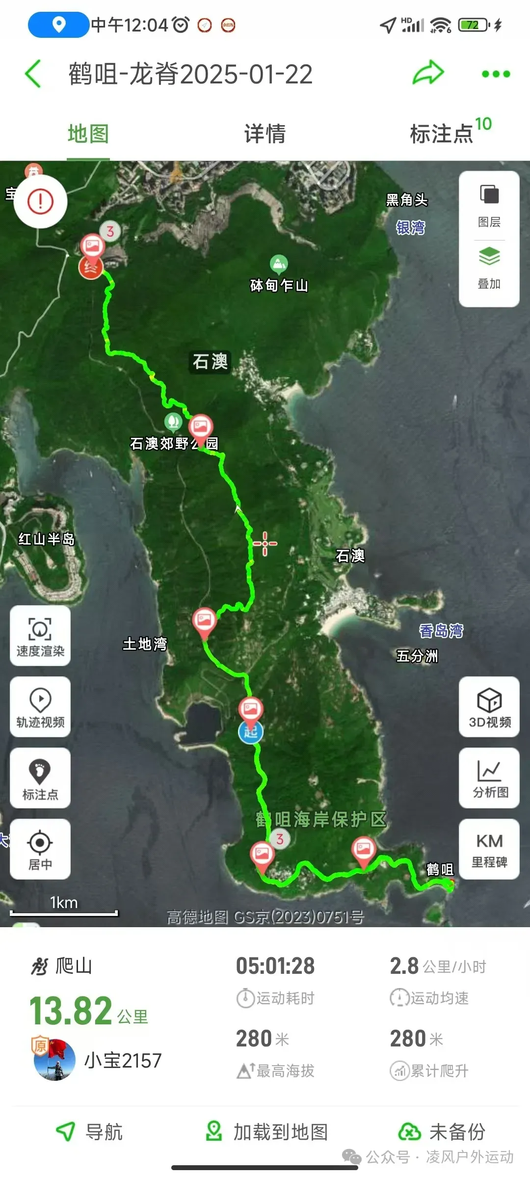 沉浸式登山徒步路线👨🏻‍🦯 11.2km+3km鹤咀站——3.5km蟹洞——3.5km返回鹤咀站——3km土地湾——1.3km 龙脊—2.7km石澳公交站鹤咀一路上2个补给点吃喝的都有 物价和市区基本一样,可以在这里吃晚餐