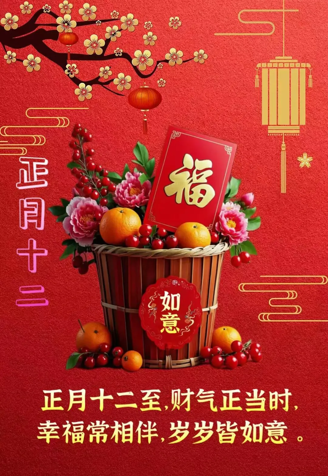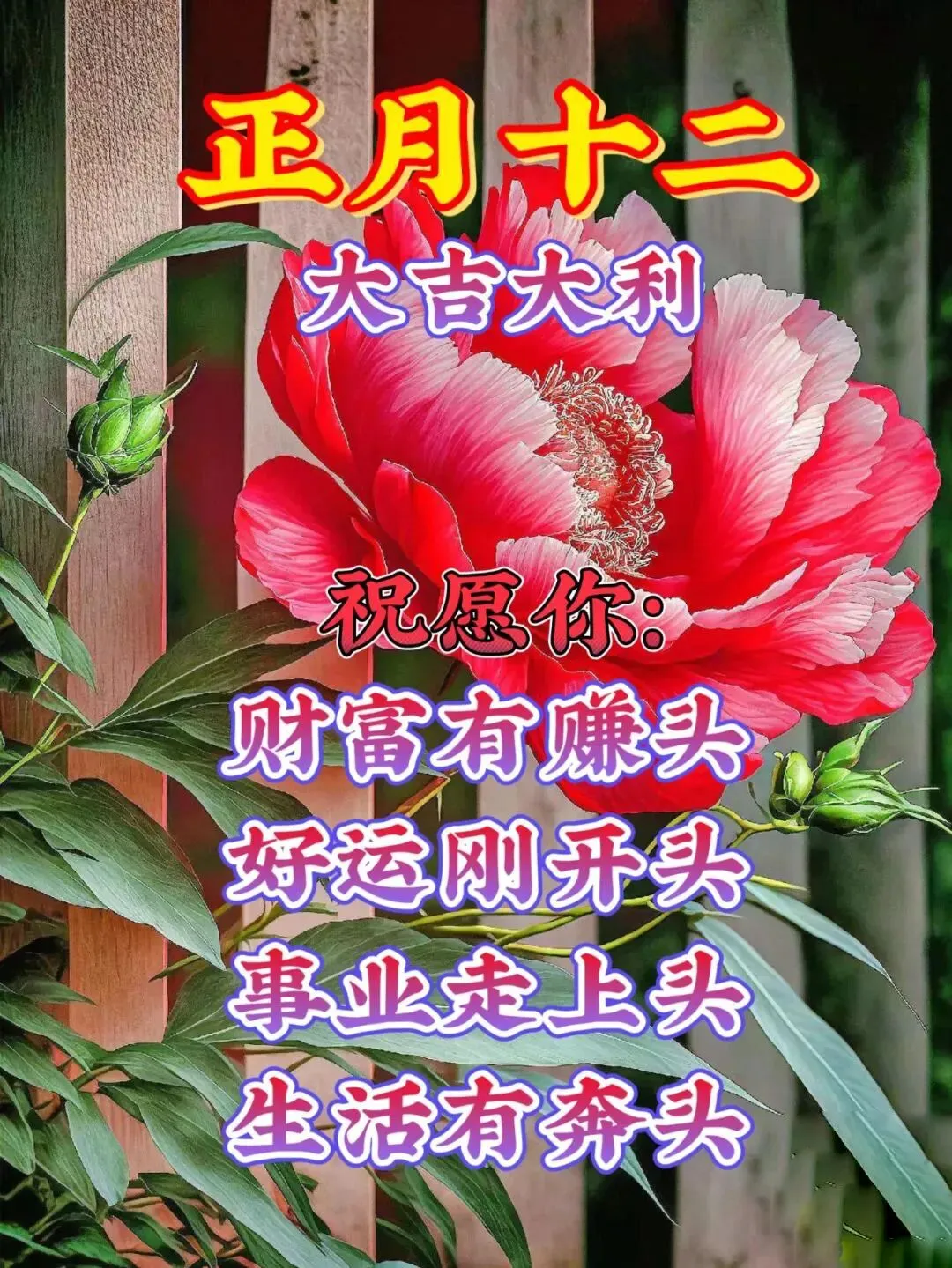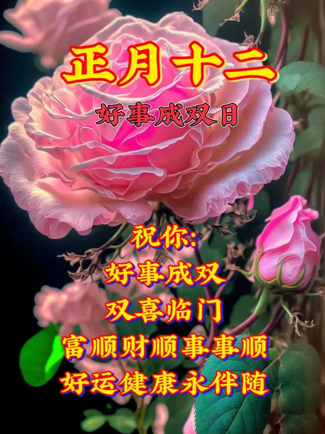 正月十二许心愿,愿快乐把你伴,愿好运把你恋,愿幸福把你念,愿健康围你绕,愿平安对你笑。2026祝你大财小财发个遍,生活顺利心儿甜!