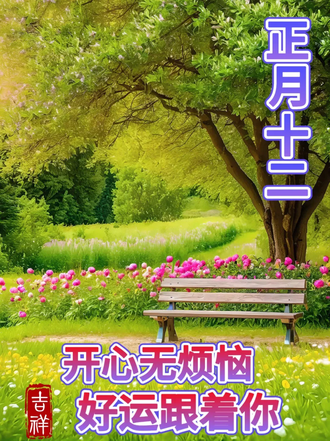 正月十二向你问个好;开心无烦恼,好运跟着跑;家人共团聚,天伦乐逍遥;朋友相扶持,心情不寂寥;事业风水顺,金银撑荷包。好运从天降生活步步高。