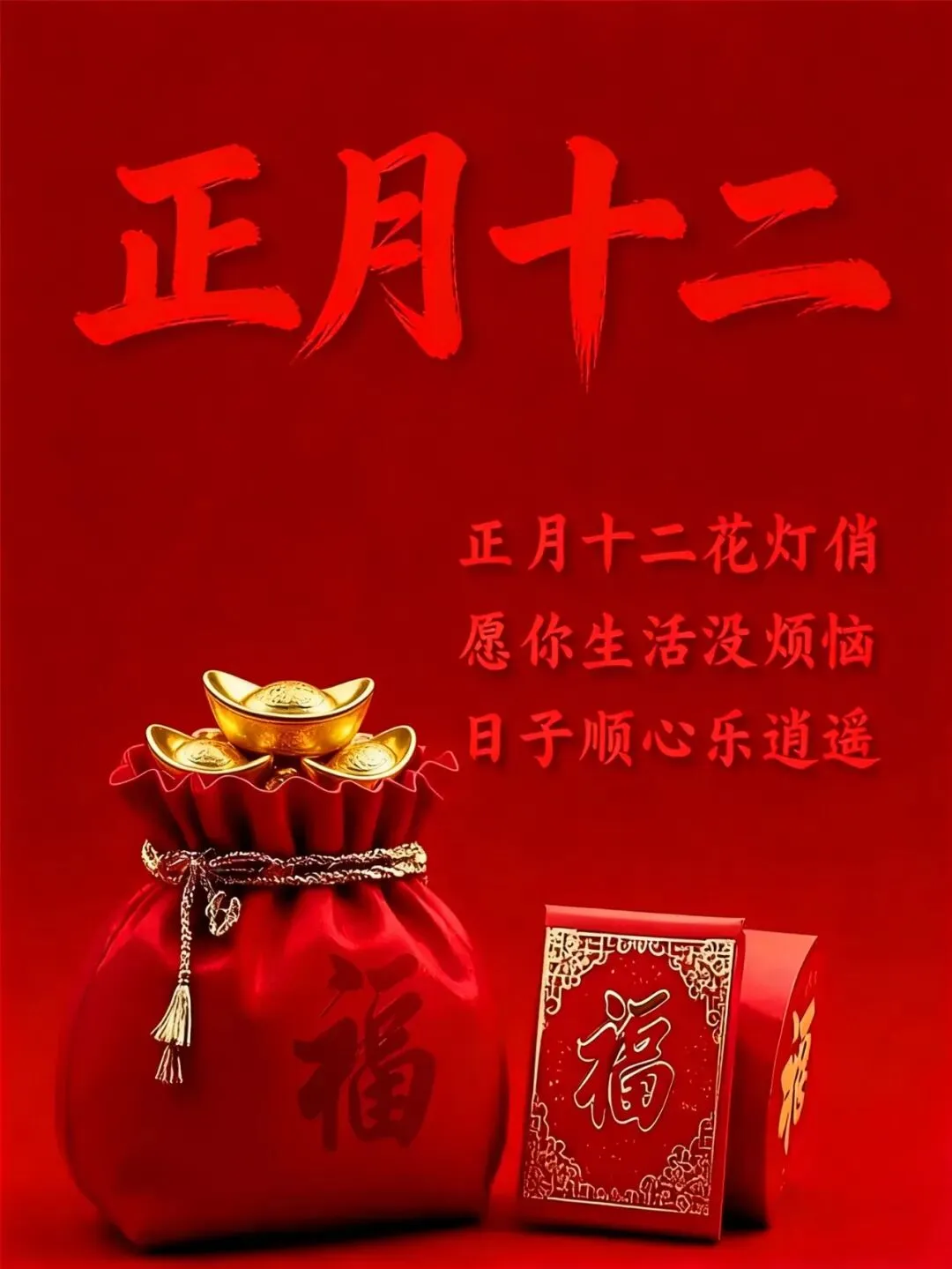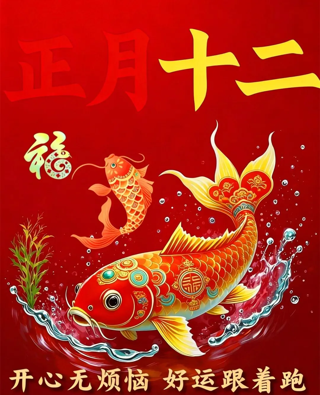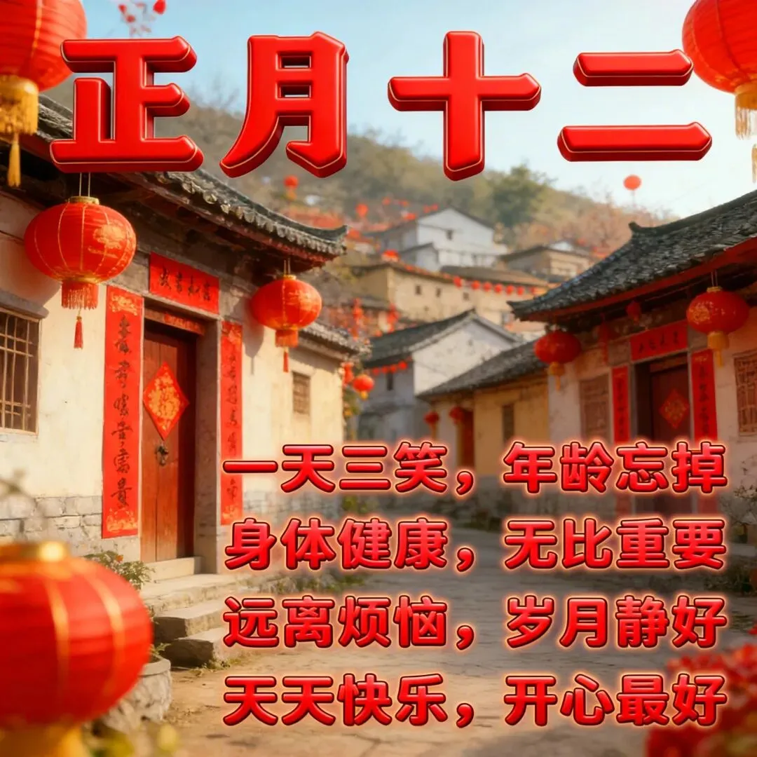 正月十二,向你问个好,开心无烦恼,好运跟着跑。愿您一年12个月里,月月没烦恼,祝福大家:一帆风顺吉星照,万事如意步步高!