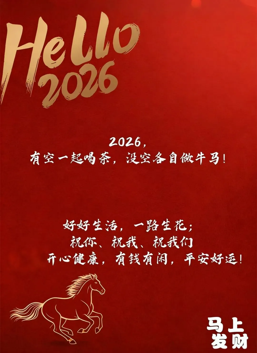 2026有空一起喝茶,没空各自做牛马,丙午马年,好好生活,一路生花,祝你,祝我,祝我们,2026开心健康,有钱有闲,平安好运!早安!