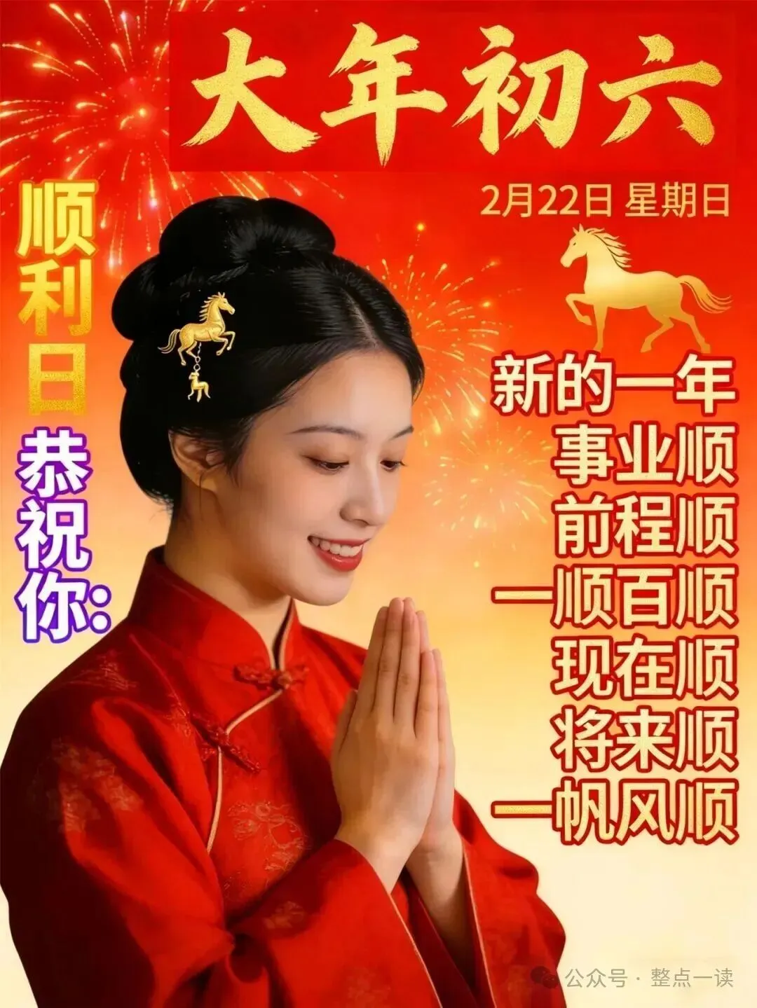 大年初六万事顺意日。在这大吉的日子里,祝愿您把身体理顺,健康幸福,把事情理顺,轻松美妙,把心情理顺,绽放微笑,把日子理顺,少些争吵。祝您在新的一年里心顺手顺万事顺,家顺业顺一路顺。🎉🌹😊🌞🌴🌼