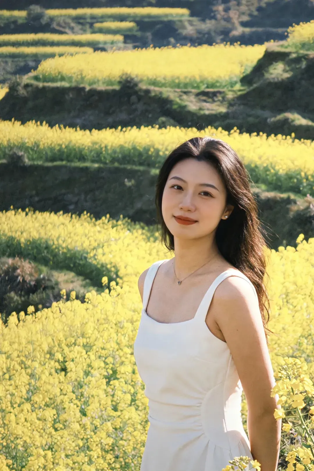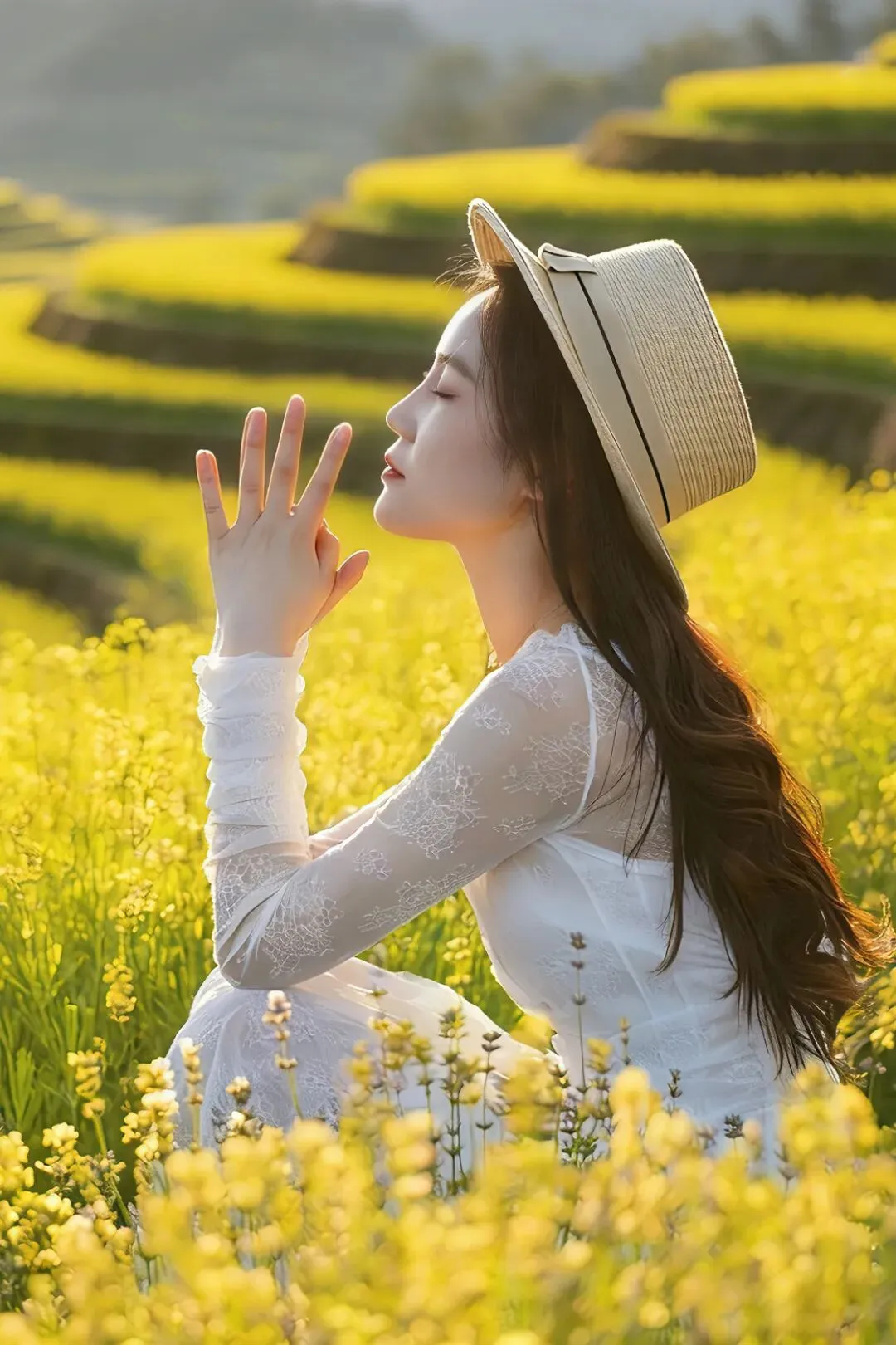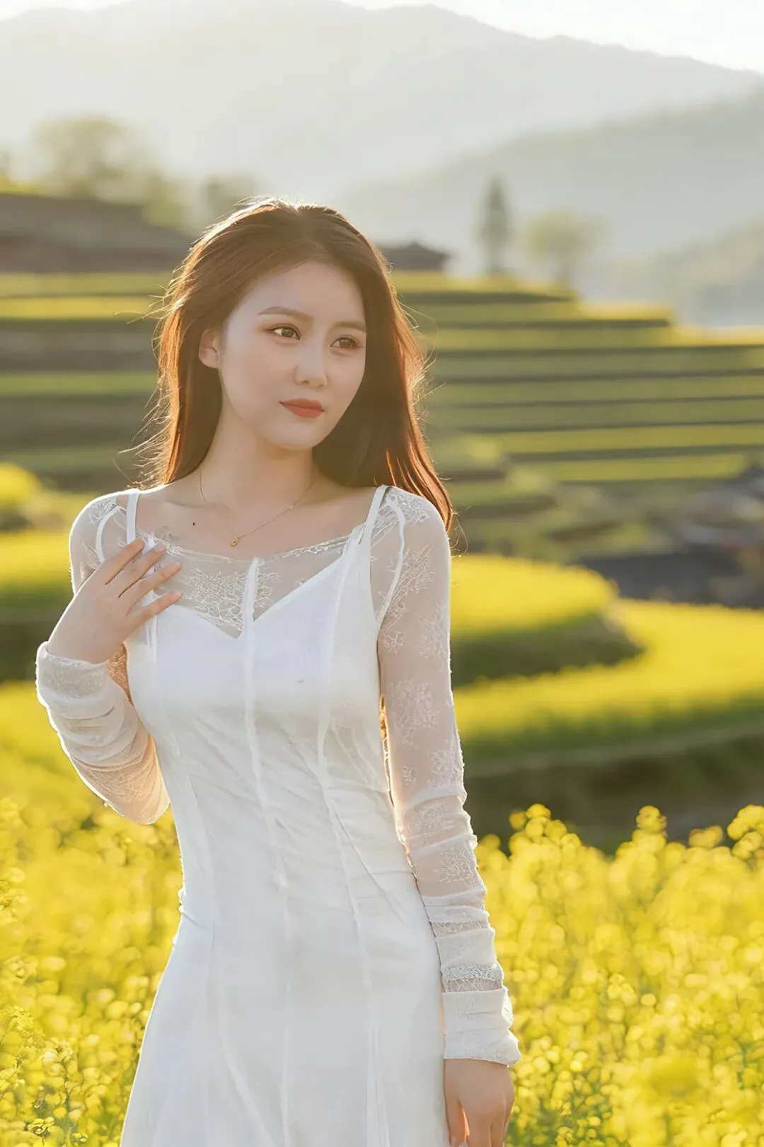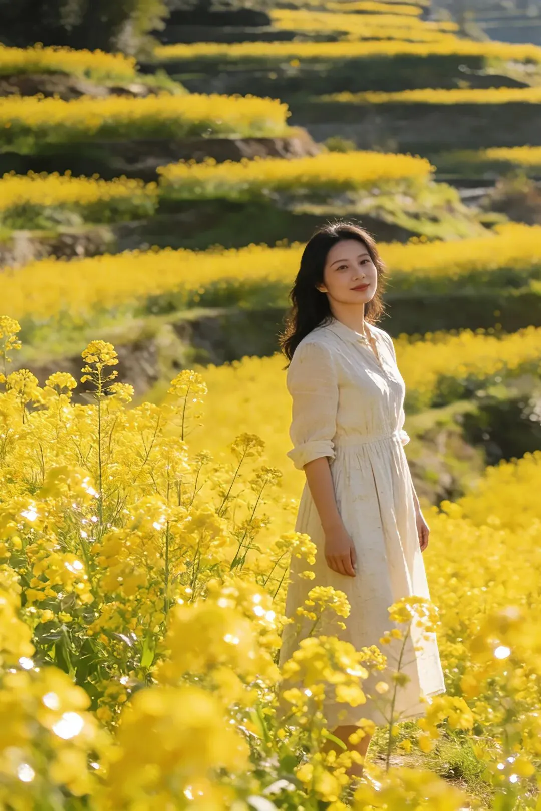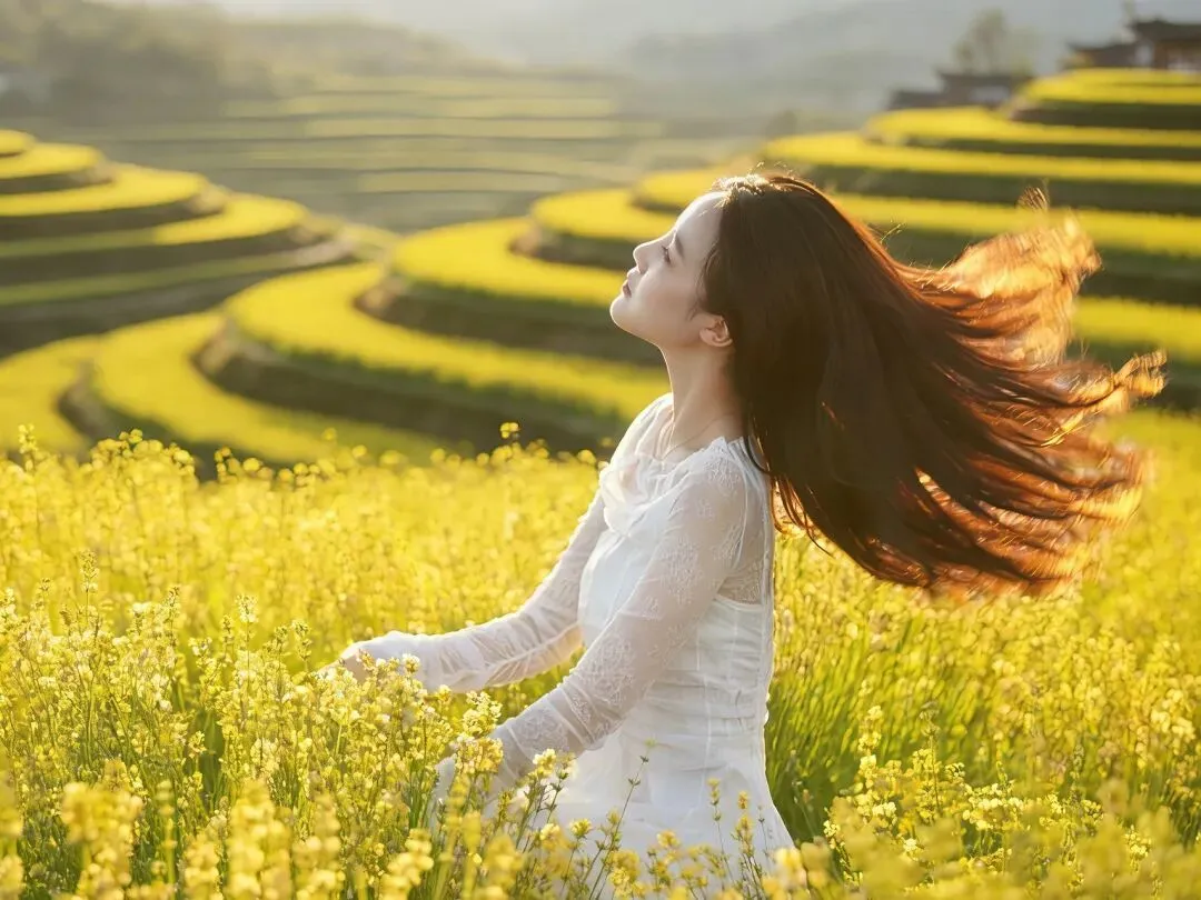 三月一到,梯田灌满春水,水面如镜,倒映着蓝天、白云、远山与炊烟。晨雾漫上来时,整个山谷如梦似幻,炊烟袅袅,田埂交错,农人春耕,一派宁静悠然的田园风光。春风一吹,油菜花顺着梯田脉络肆意绽放,金黄与嫩绿交织,阳光洒下,整片山谷都变得温暖明亮。