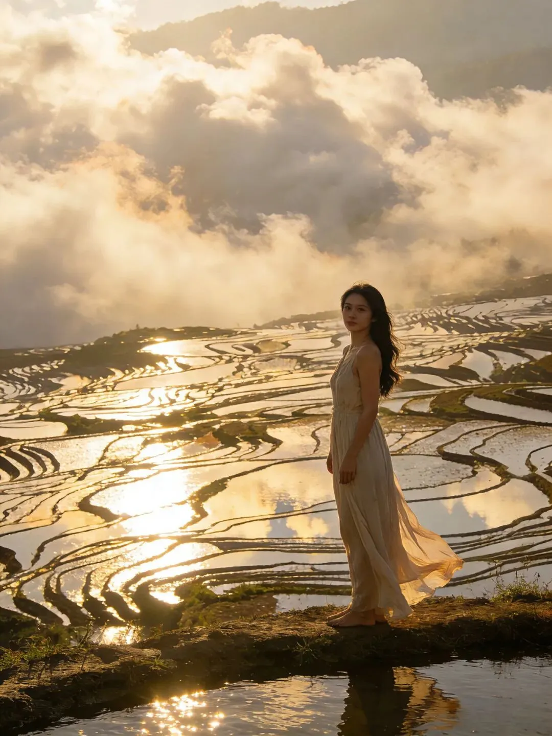 ✅ 元阳哈尼梯田灌水期的坝达梯田,天光云影共徘徊,3700级天梯直抵云霄,航拍视角下,大地如镜,光影流动,震撼心灵。日出与日落时分,梯田被染成金红色,是一生难忘的视觉盛宴。
