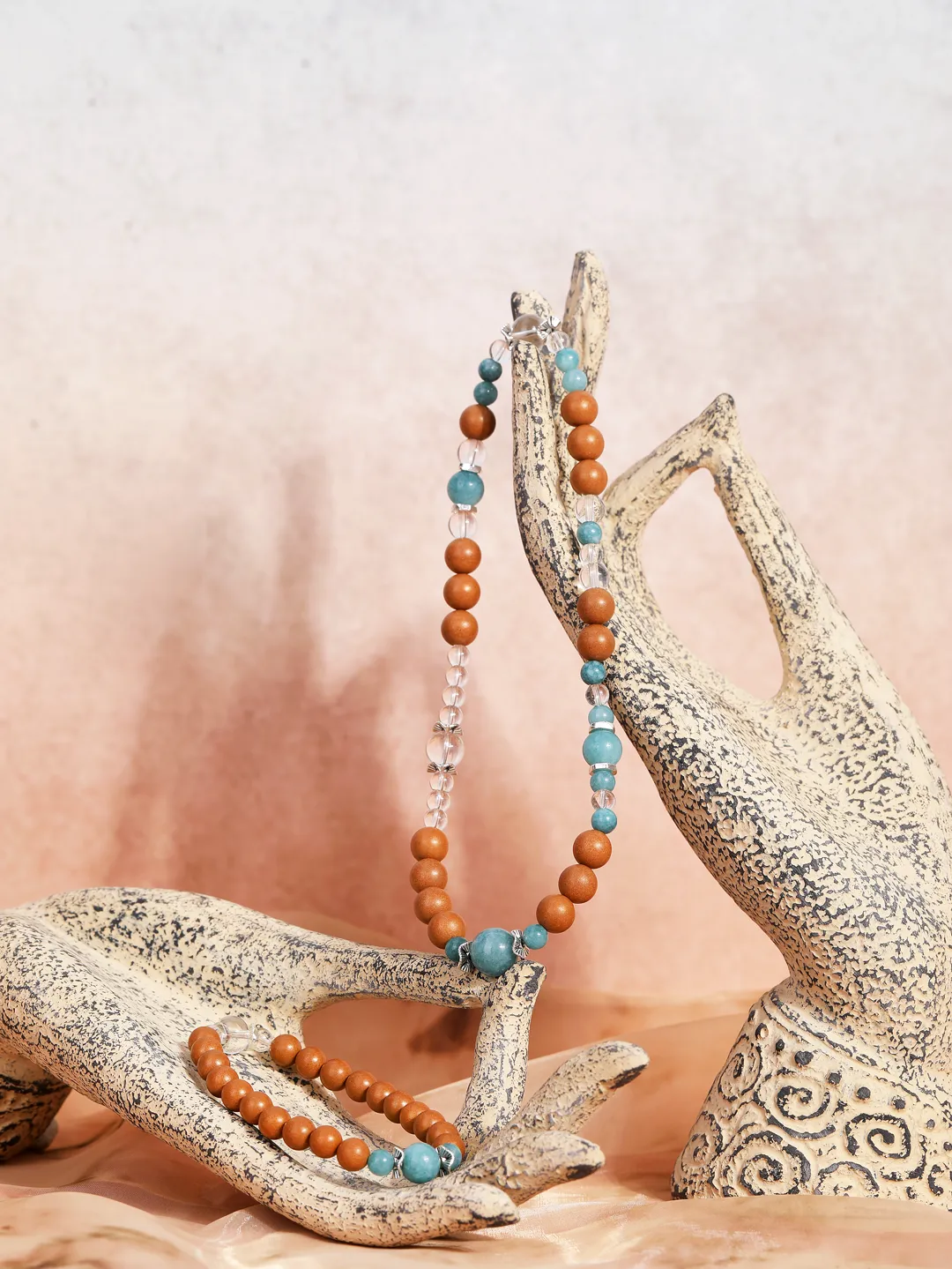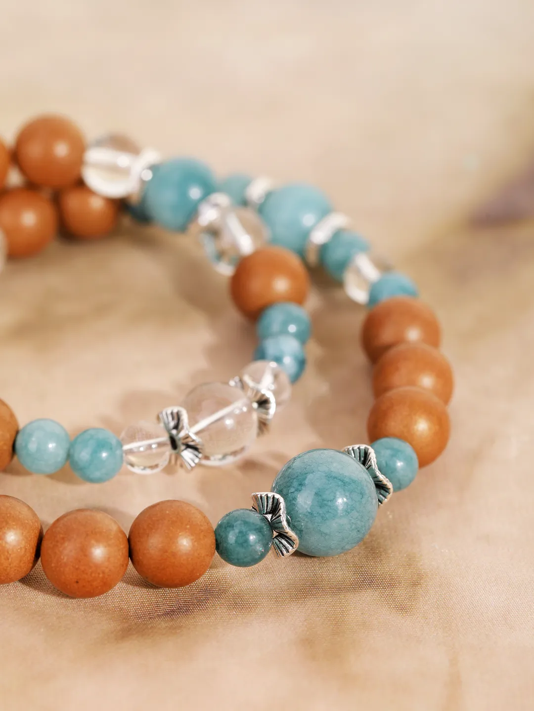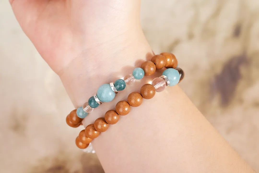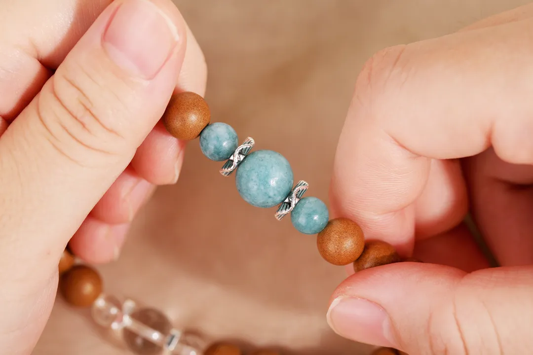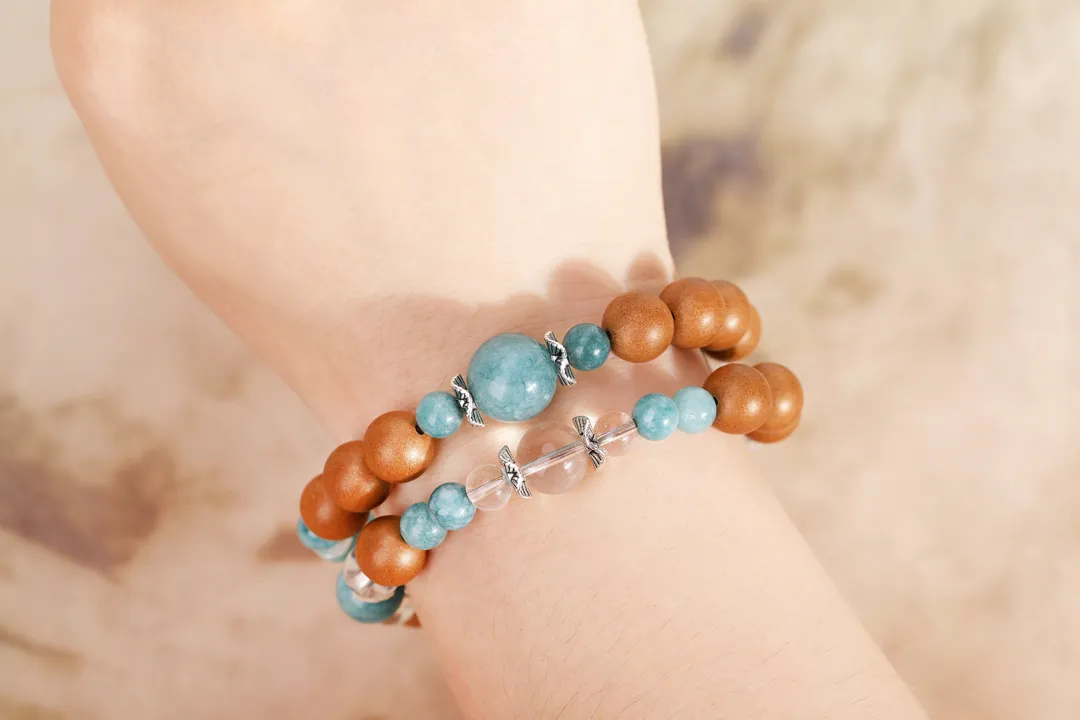白水晶代表干净的磁场,蓝翡就像流动的敦煌星空,寓意财运与安宁,与香珠形成“刚柔相生”的平衡智慧。