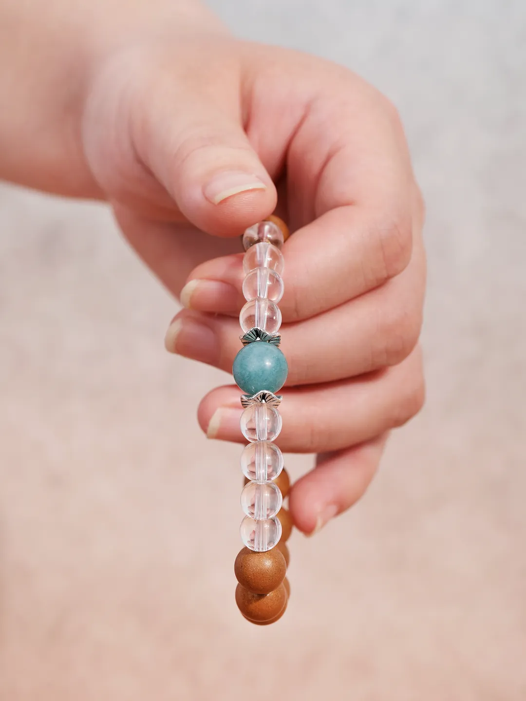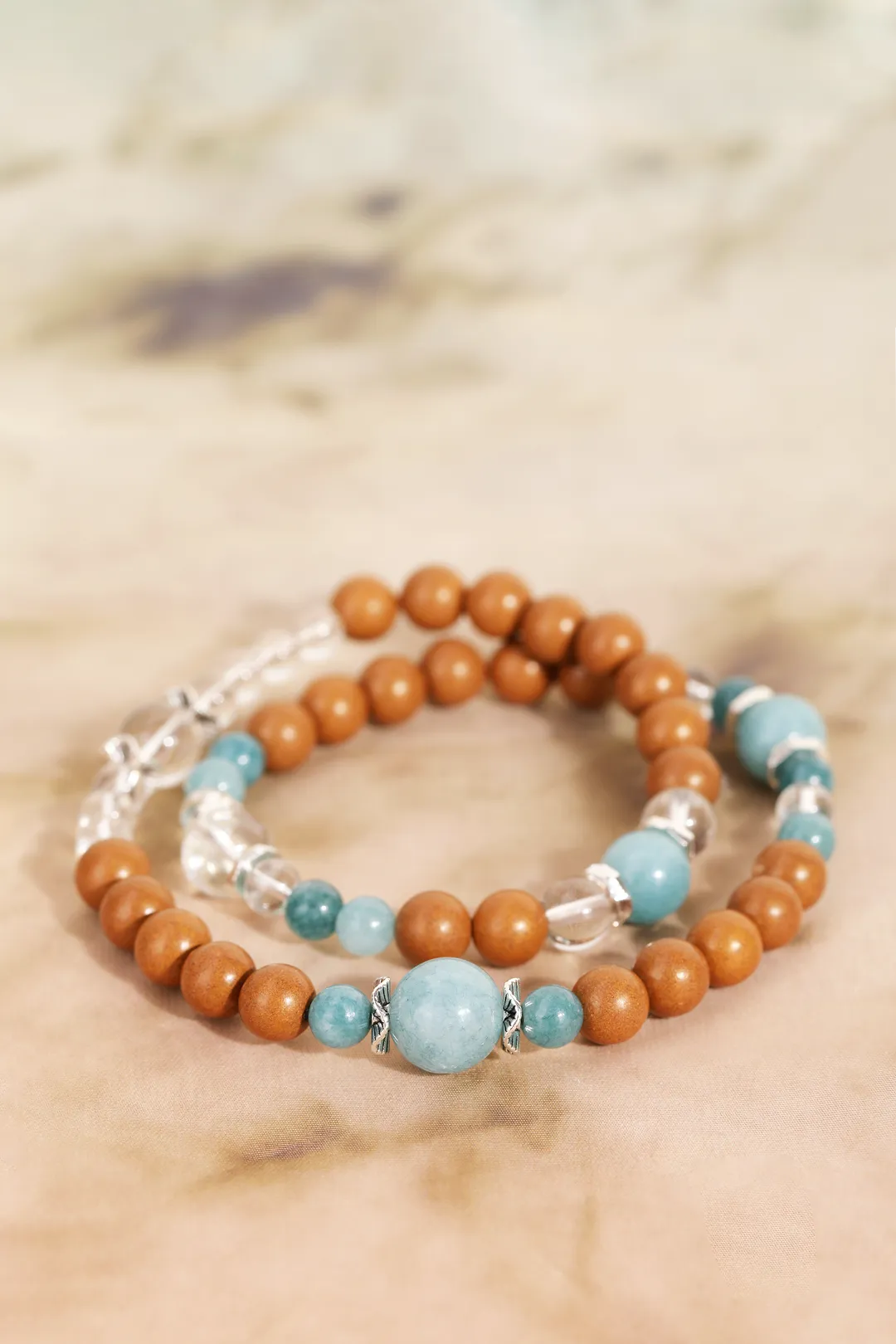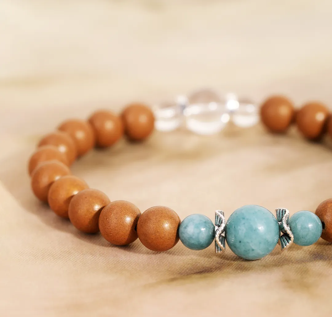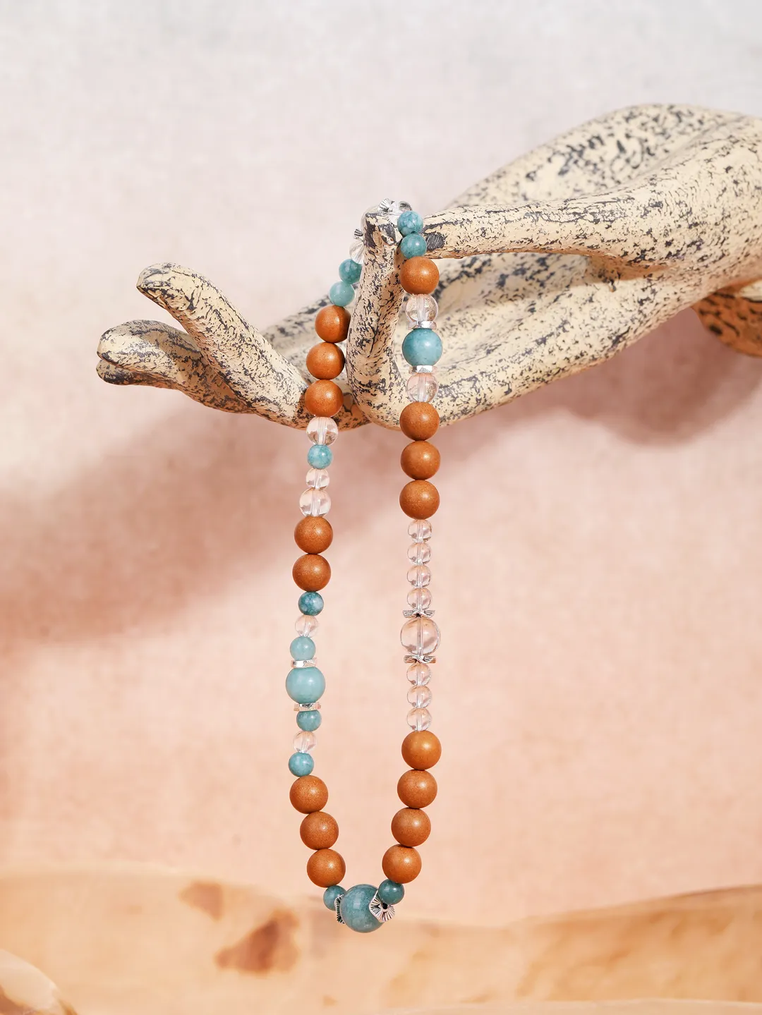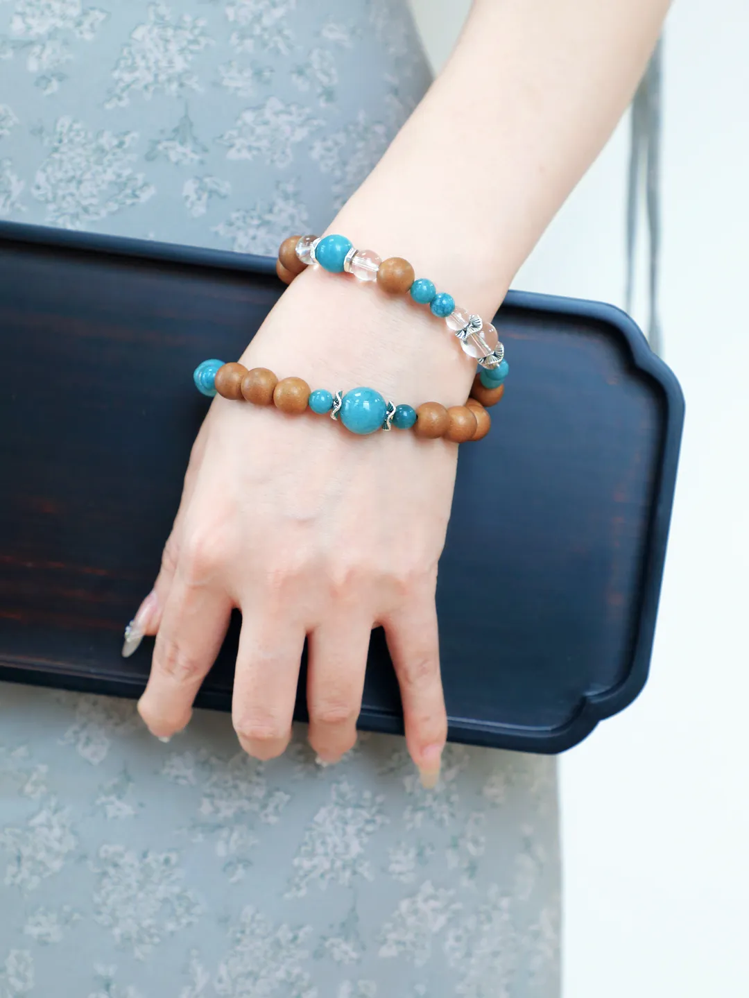 白水晶代表干净的磁场,蓝翡就像流动的敦煌星空,寓意财运与安宁,与香珠形成“刚柔相生”的平衡智慧。