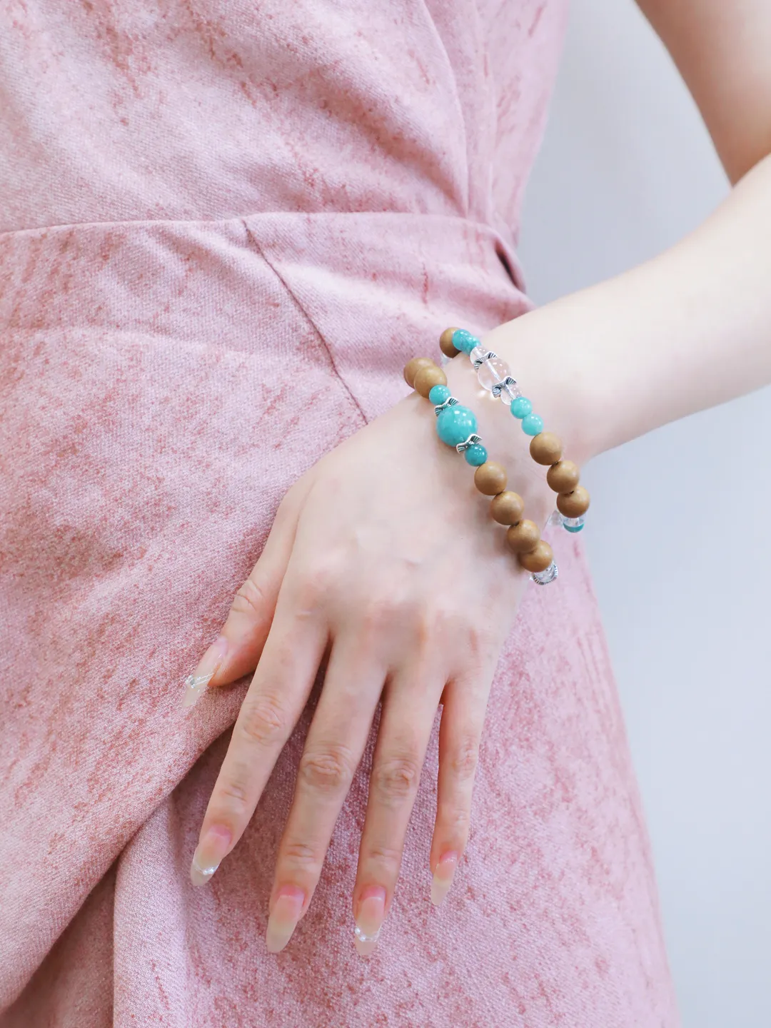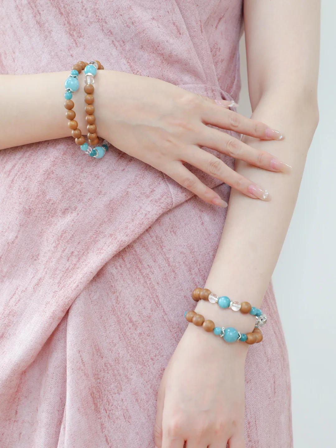 这款敦煌香珠一共给家人们精挑细选了2种款式,一款是以蓝翡和白水晶为配饰,不挑年龄,更适合女性;