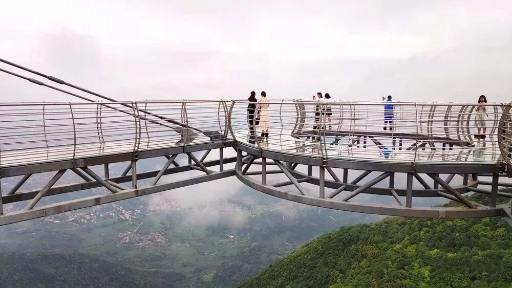 14:00 乘坐【观光车】游览1080米茶庄园,抵达【玻璃观景台——1300云端玻霸】,高空俯瞰,一道一风景,一念一时光,山景风光尽收眼底,行走其上,恍如“人在空中走,景在脚下游”。立于云端,高声呐喊、尽情拍照,林木青葱,惊险刺激中透露着一份少有的美,玩的都是心跳。云端玻璃观景台是目前国内落差最高的玻璃观景台,主体部分悬挂在落差800多米的悬崖之外,观景台的悬挑采用的是无钢架支撑设计,伸出崖壁外42米。