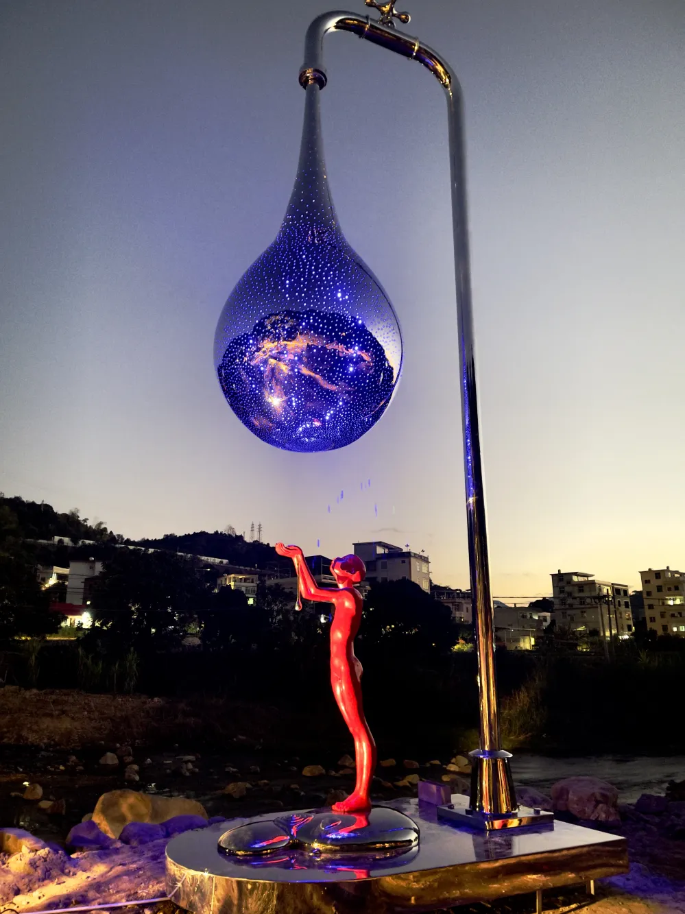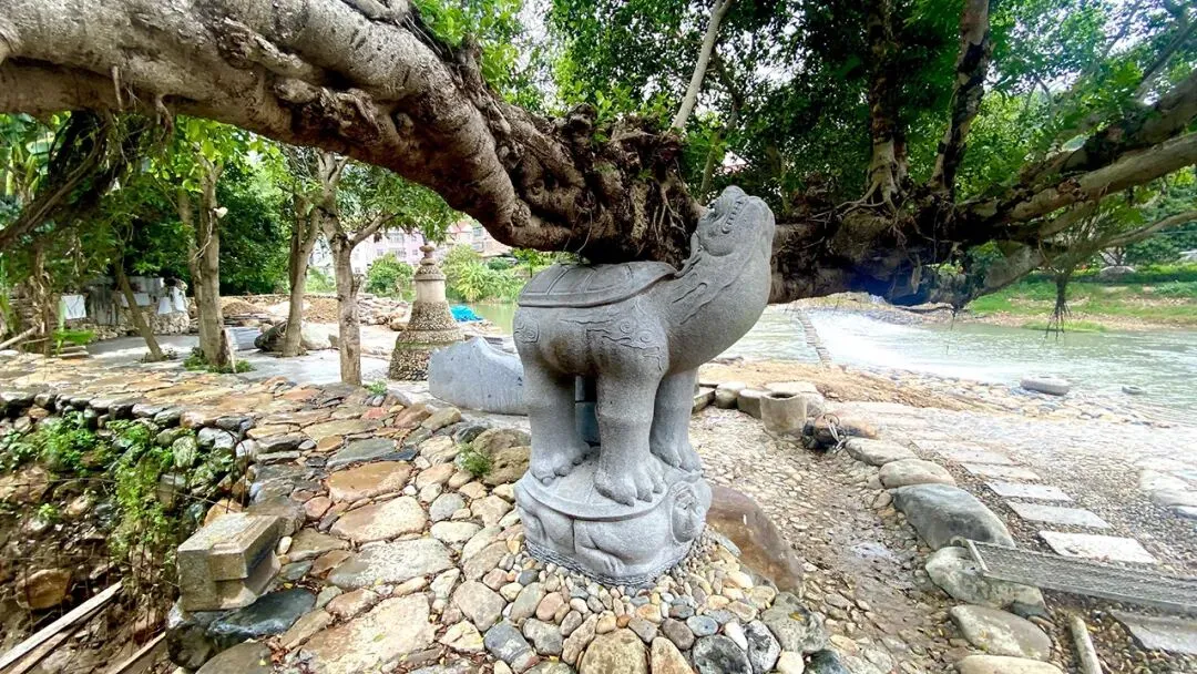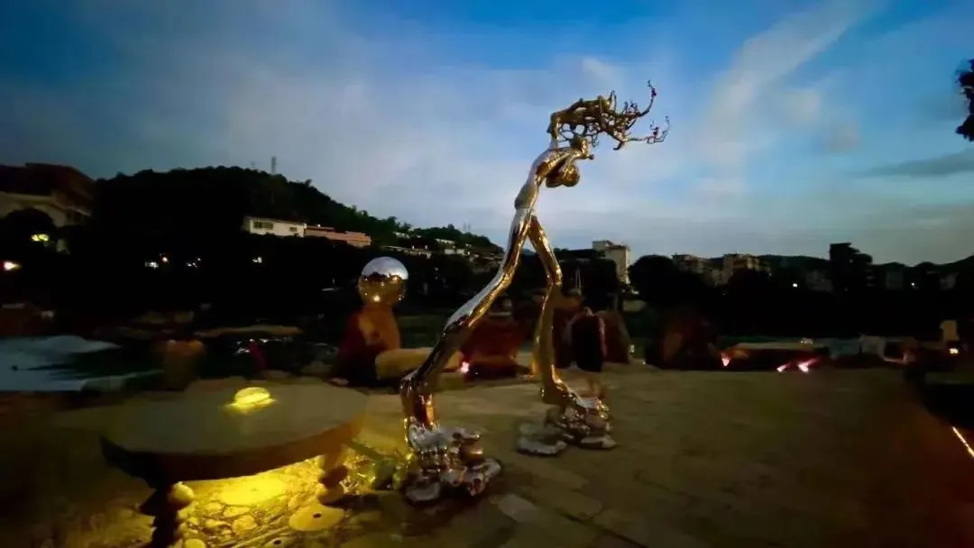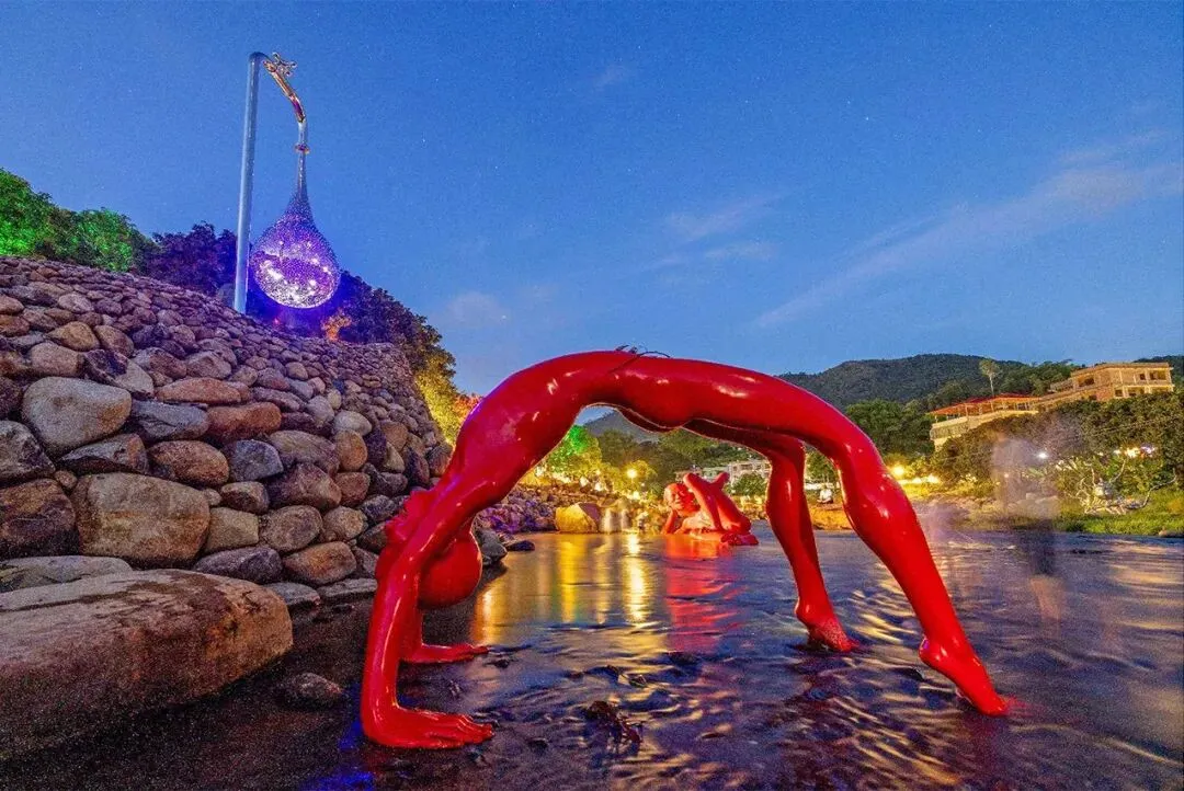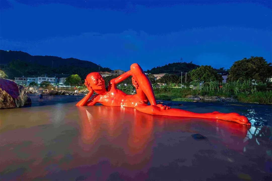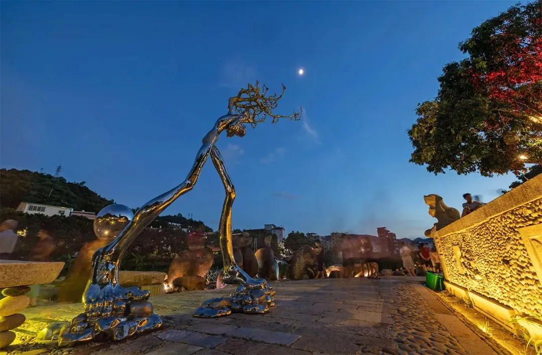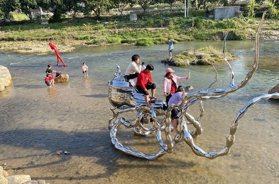 让人好奇的是,在当地的母亲河——金谷西溪的一大片河滩上,随着河岸自然起伏,风格各异的艺术作品散落各处,形式多样,想象力丰富,和村民生活无缝结合:高耸的现代风格雕塑下,走过放羊的老人;光滑的雕塑脊背上,坐着嬉闹的顽童;商贩、游人、村民在艺术品间自由穿行,白发垂髫共享怡然之乐,宛如一大片露天文化园,又像一个自由的艺术乌托邦。
