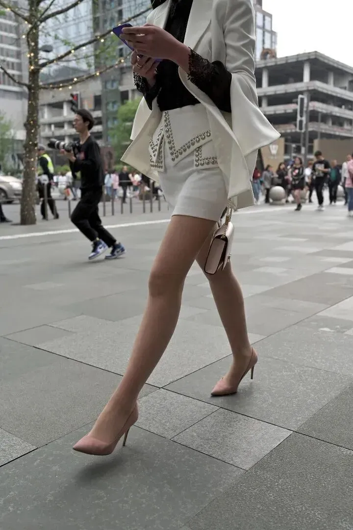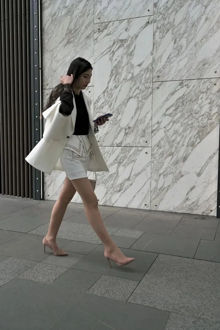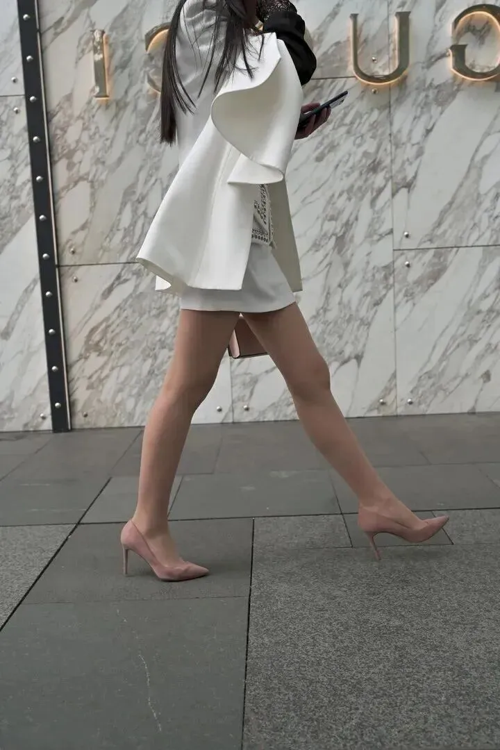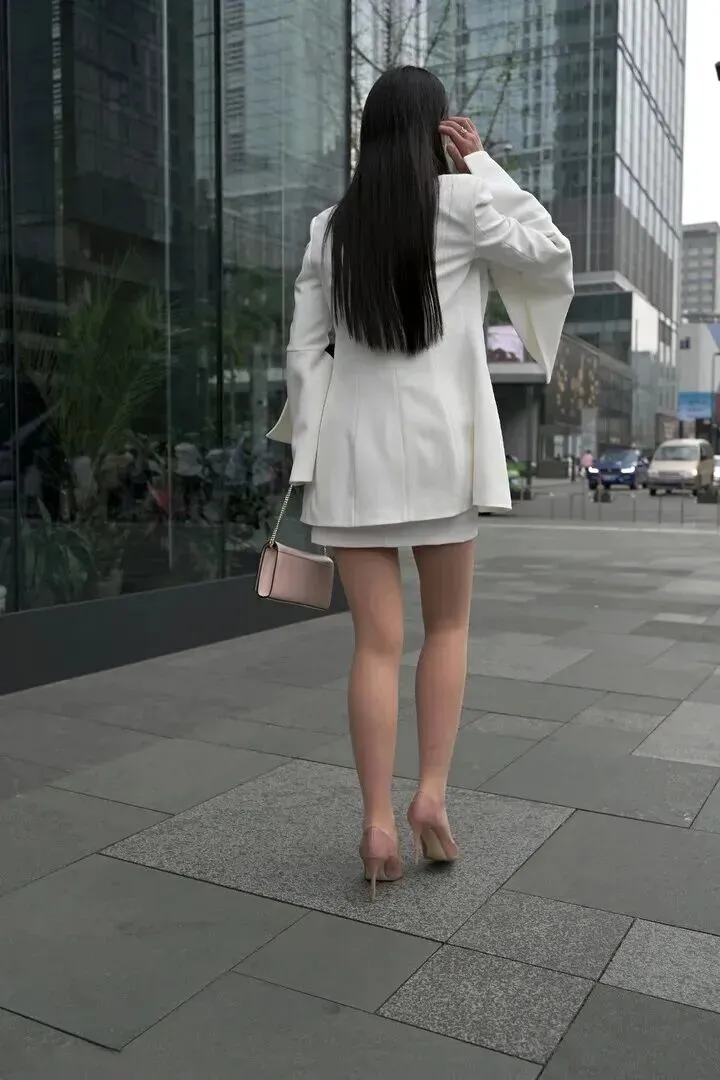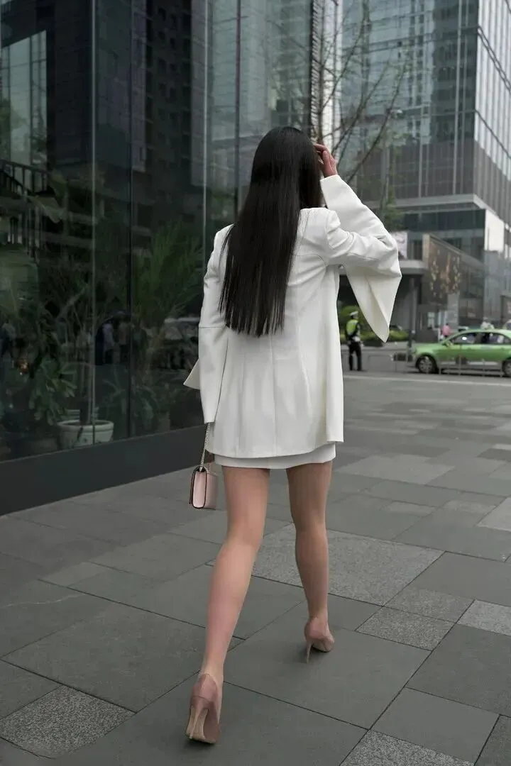 光看背影.就觉得.氛围感拉.满。修身白西.装搭配垂顺.长发,脚踩粉.色高.跟,身材曲线.勾勒得.恰到好.处。这.身打扮走.路带风,.气场全开,约.会逛街都是.焦点。